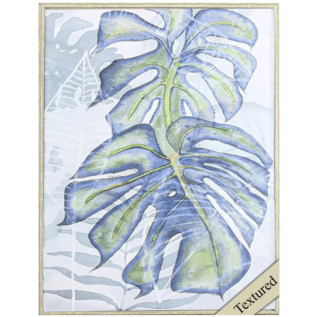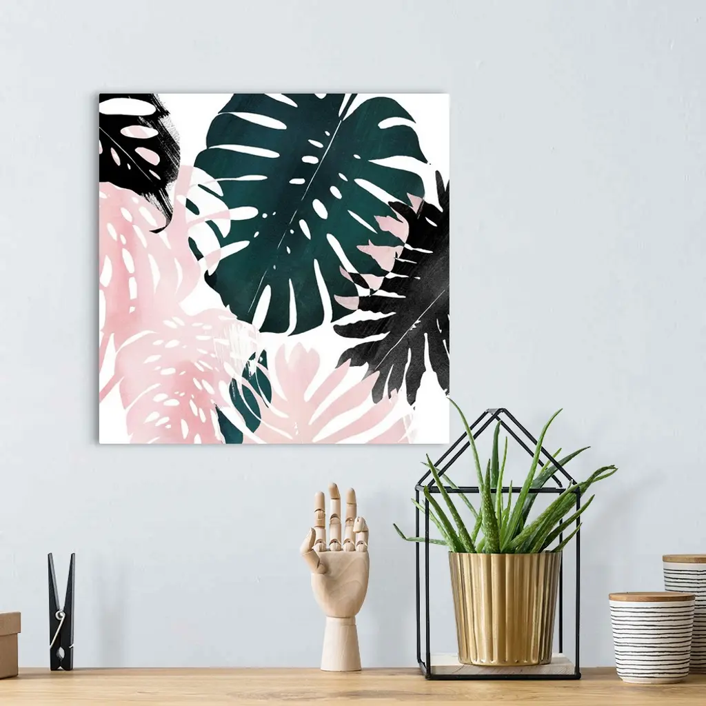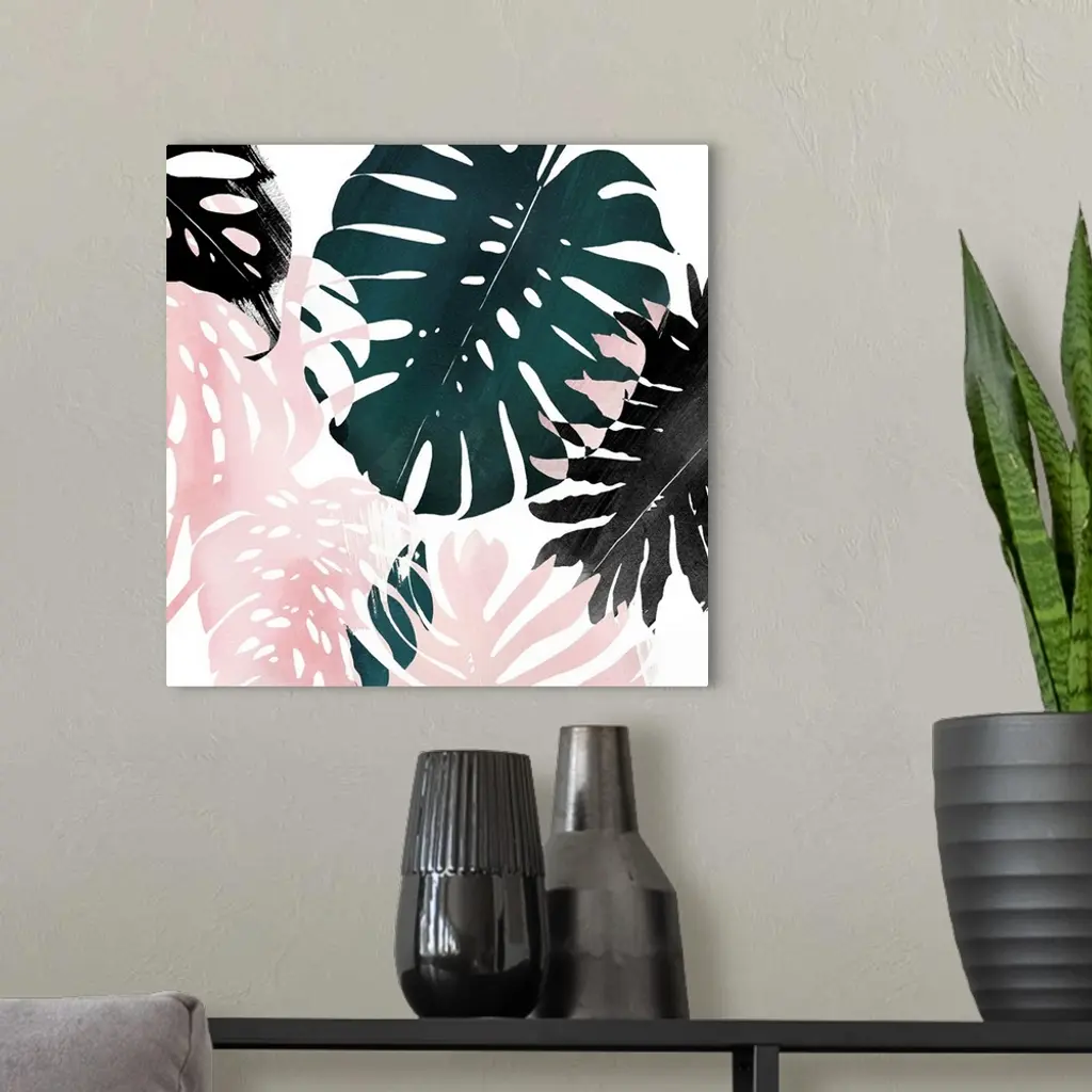 Contemporary painting of pink, green, and black tropical palm fronds.