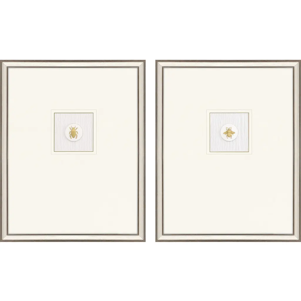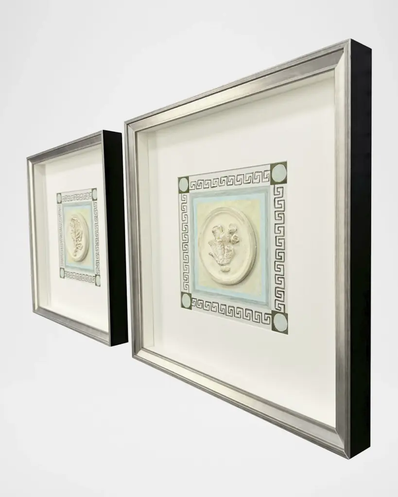 "Coral Circles II" features hand-cast gypsum plaster intaglios of coral specimens on a lively giclee on paper background. Mounted behind glass glazing in a silver leaf-finished wood shadowbox frame Overall, approx. 20"Sq. x 2"D each Wire attached to the back for hanging Includes hanging hardware Wipe clean Weight, 14.0 lbs each Set of two Made in USA Boxed weight, approximately 18.0 lbs Proposition 65 warning for California residents Shipping Direct from Vendor, usually ships within 30 business days. undefined