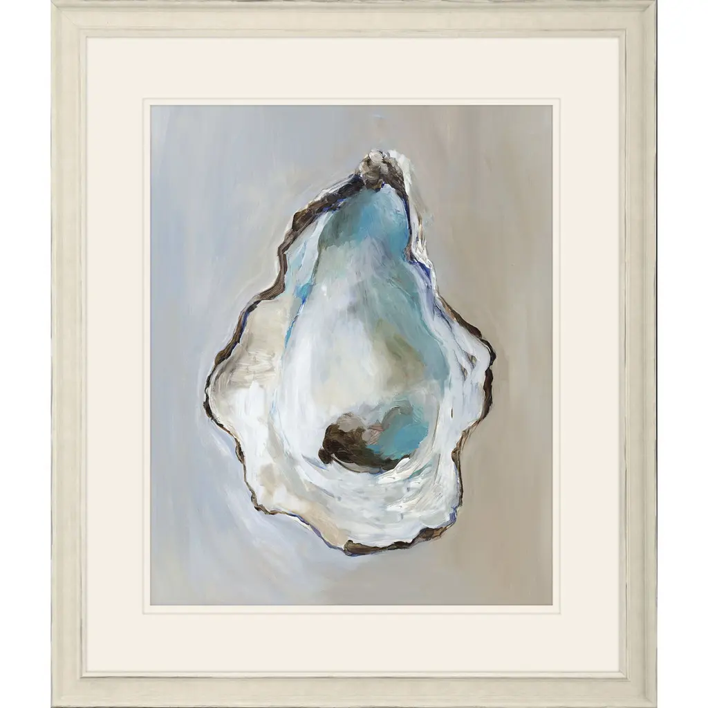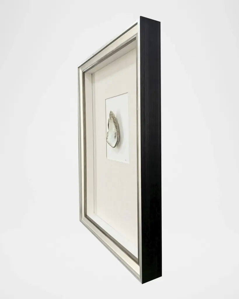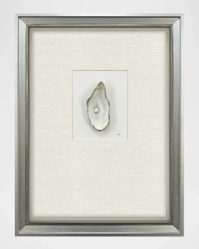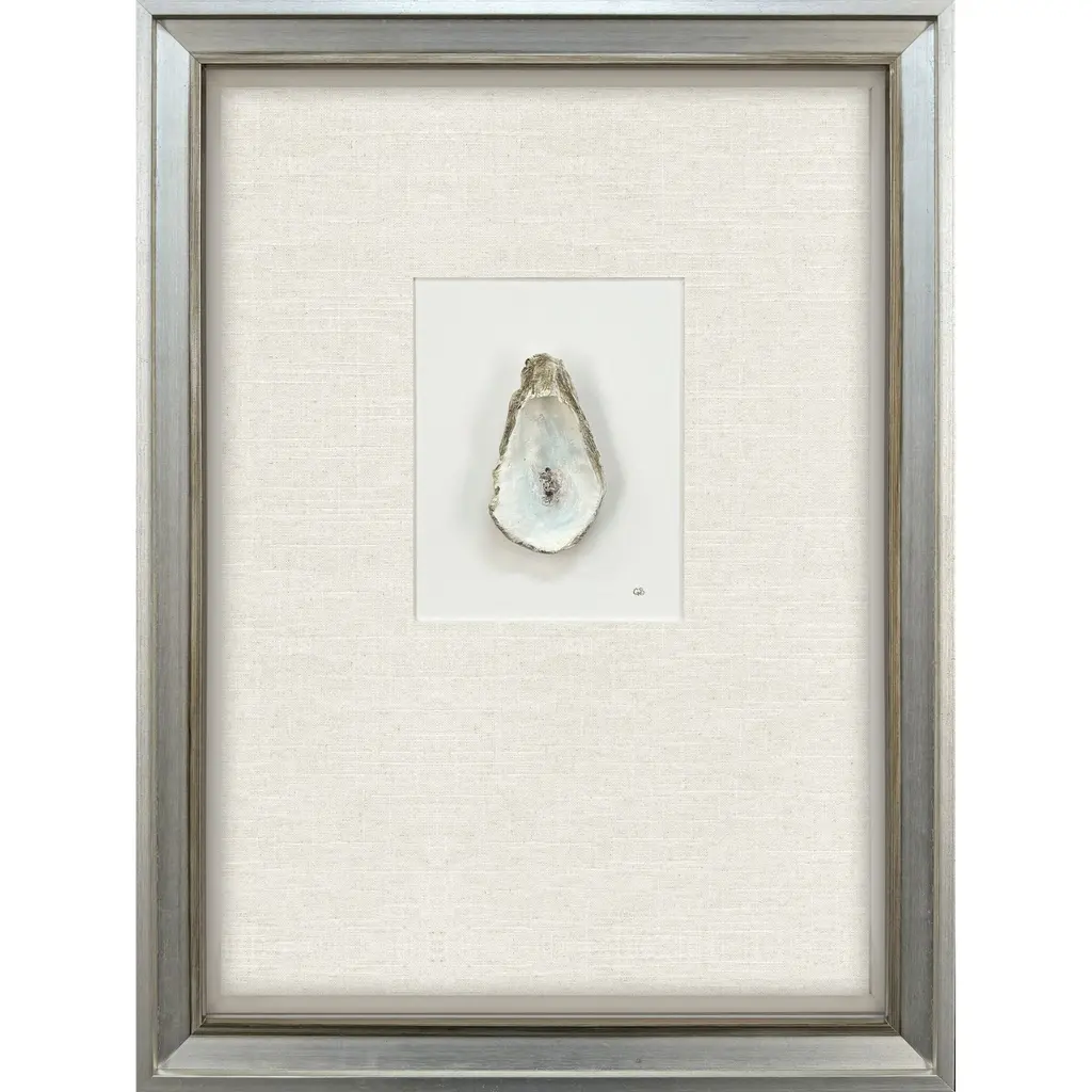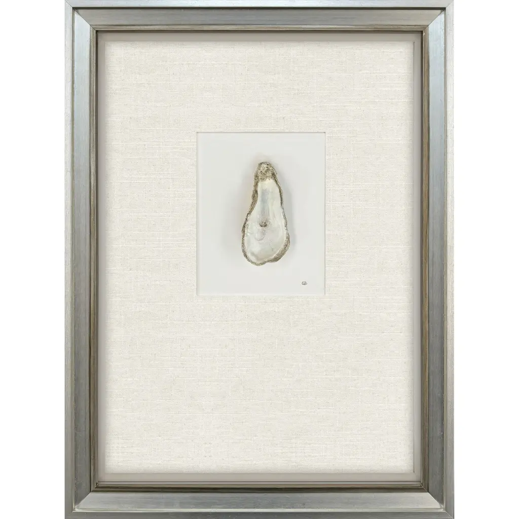 "Oyster in Paradise III" features a hand-cast gypsum plaster oyster on paper. Matted and framed in a silver leaf-finished wood and glass shadowbox, it arrives ready to be hung. Overall, approx. 19"W x 3"D x 26"T Wire attached to the back for hanging Hangs vertically Includes hanging hardware Wipe clean Weight, 10.0 lbs Made in USA Boxed weight, approximately 15.0 lbs Proposition 65 warning for California residents Shipping Direct from Vendor, usually ships within 30 business days. undefined