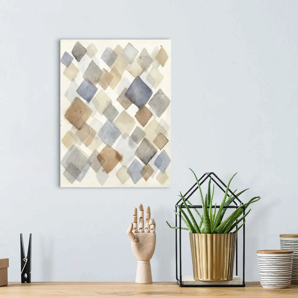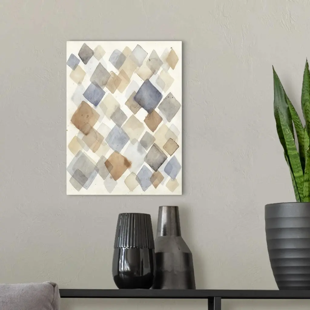 Contemporary abstract painting using diamond shapes in pale watercolors.