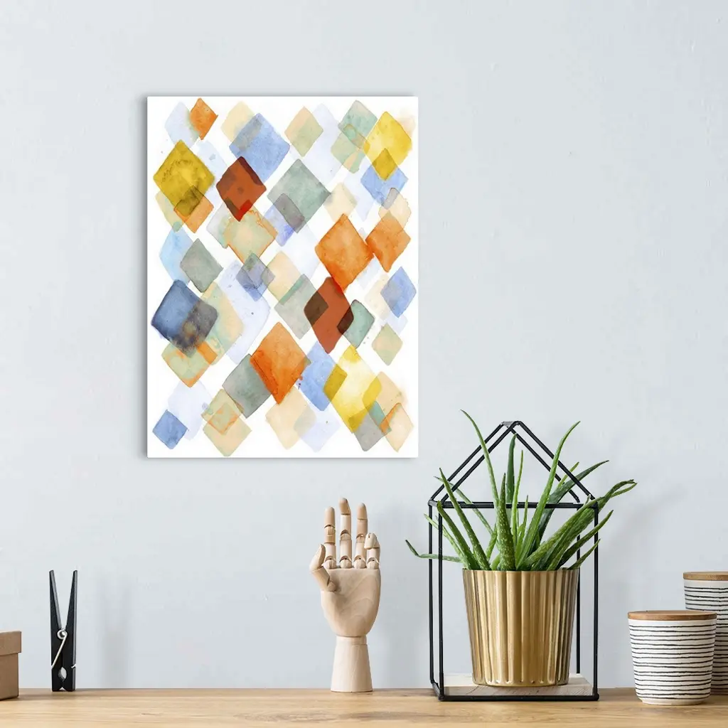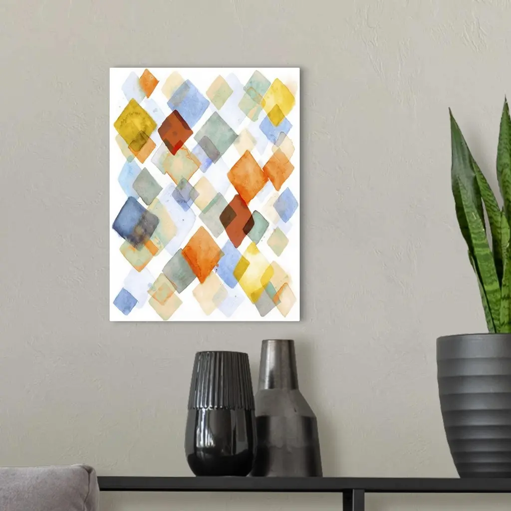 Contemporary abstract painting using diamond shapes in vibrant watercolors.