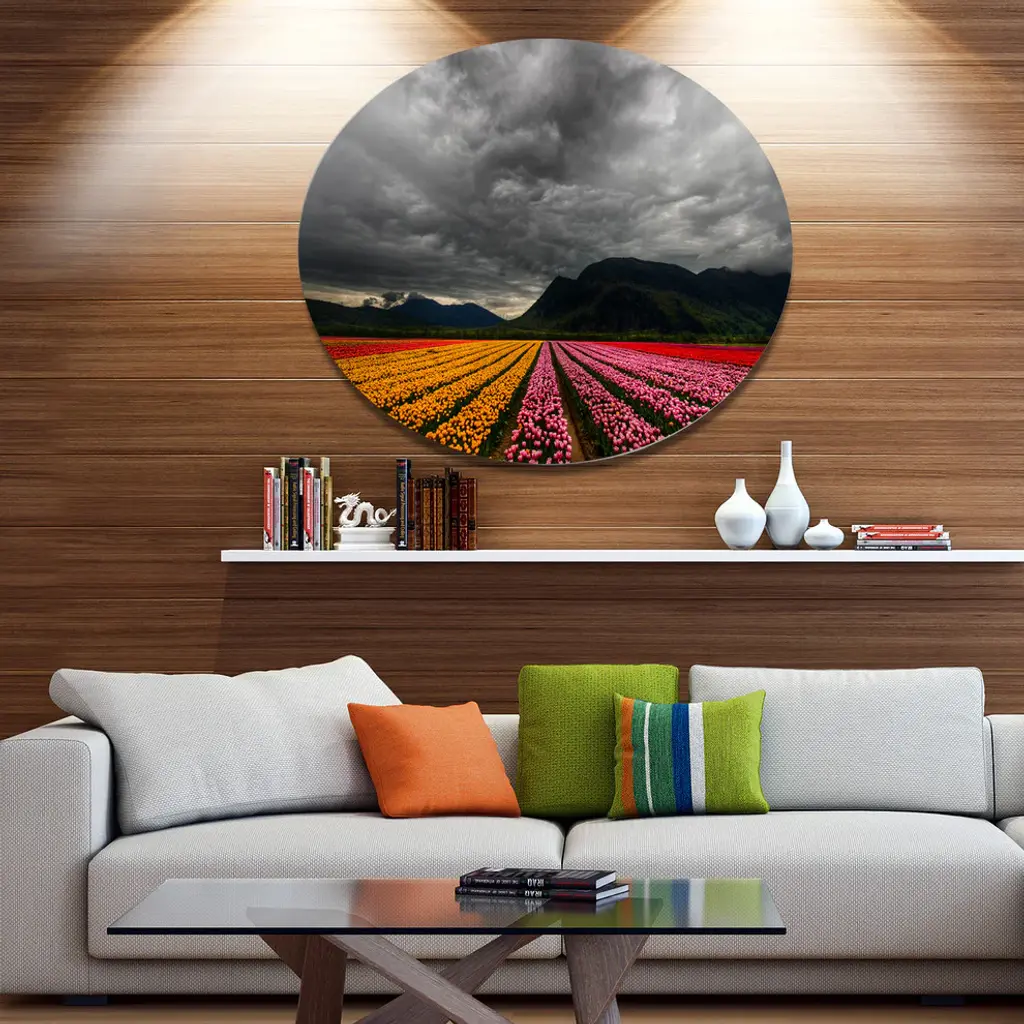 Bring Contemporary Abstraction to your home with this large Circle Metal wall art. This Parallel Rows of Colorful Tulips Metal Artwork makes it the focal point of any room or office. - White Gloss Coating ensures colors are extra vibrant with light reflection.- Aluminum grade Sheet Metal with 1 inch mounting frame on the back giving the illusion that the artwork is floating on the wall..- Mounting Brackets are included along with instructions.- High Quality Digital images are created directly into a glossy aluminum panel producing a stunning and captivating print into the glossy finish of the metal.- Water, Fire and Scratch resistant HD Aluminum panels.- Looks better than any photo paper and guaranteed to last at least 20 years- Easy to clean with a microfiber cloth. Colors are far superior to regular Canvas Art. - Easy to Hang