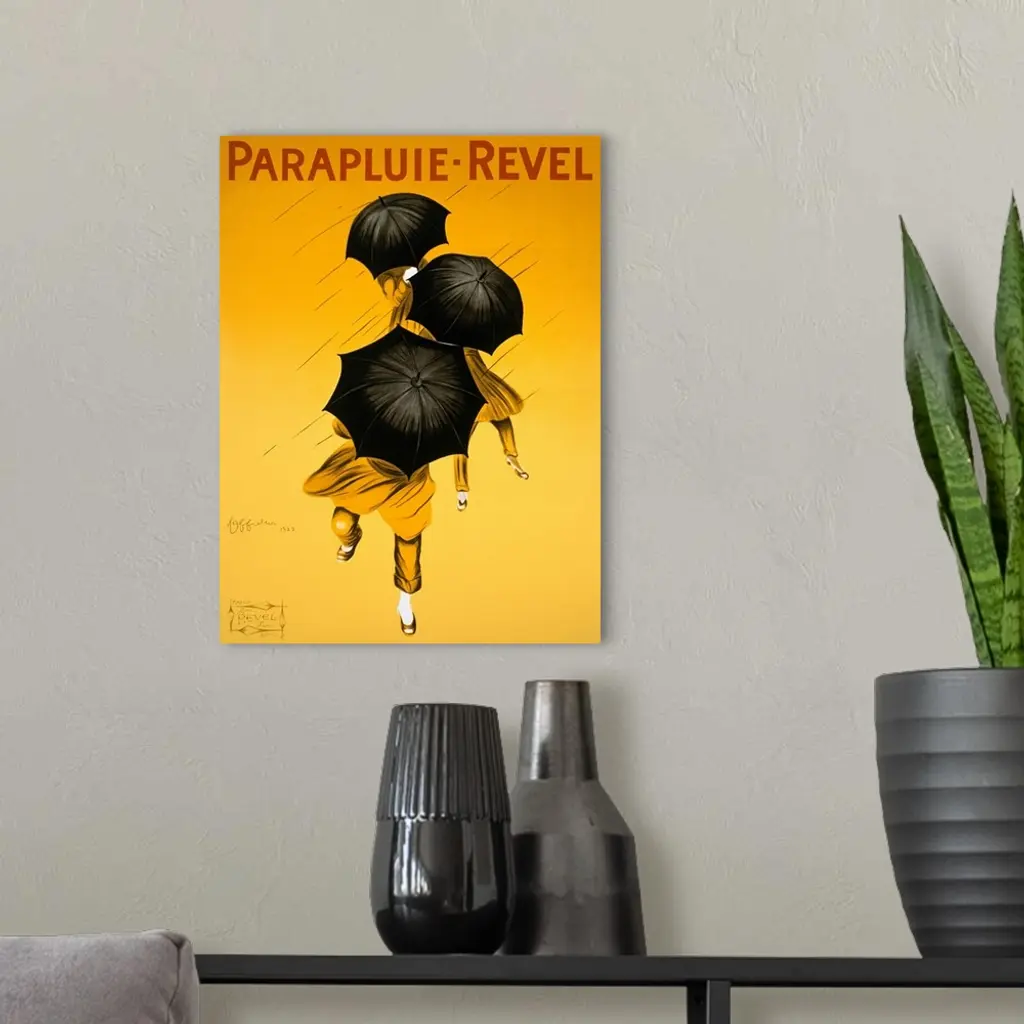 Big vintage art shows three women with umbrellas in the rain of a Parapluie Revel advertisement.