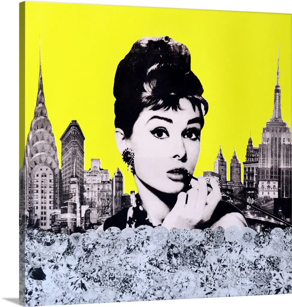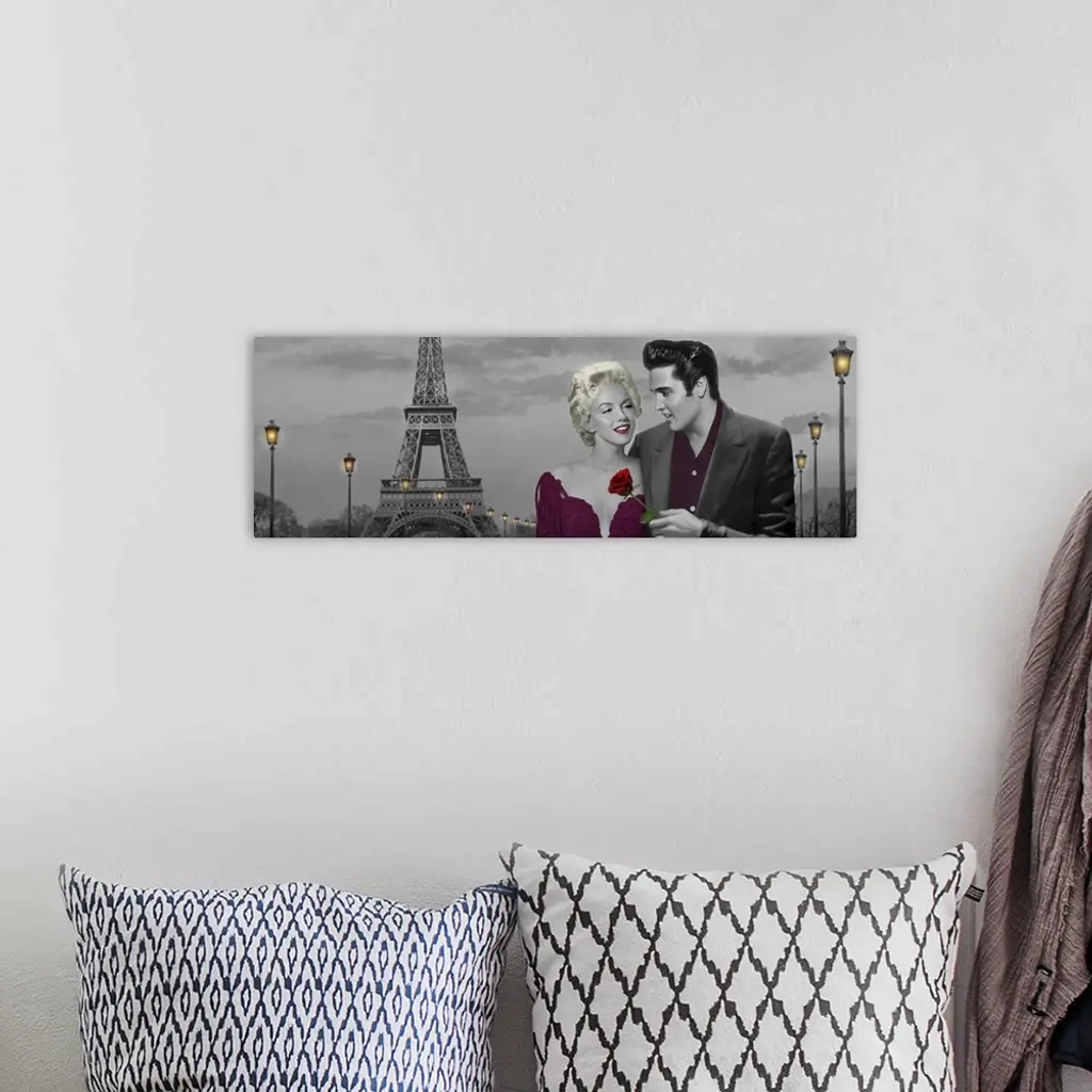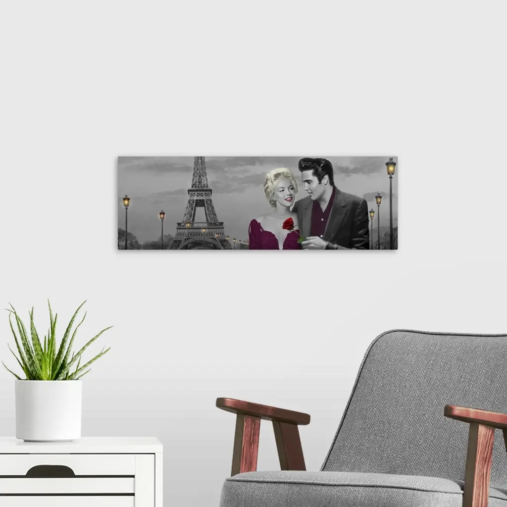 Painting of Marilyn Monroe and Elvis Presley on a date together near the Eiffel Tower in Paris, France.