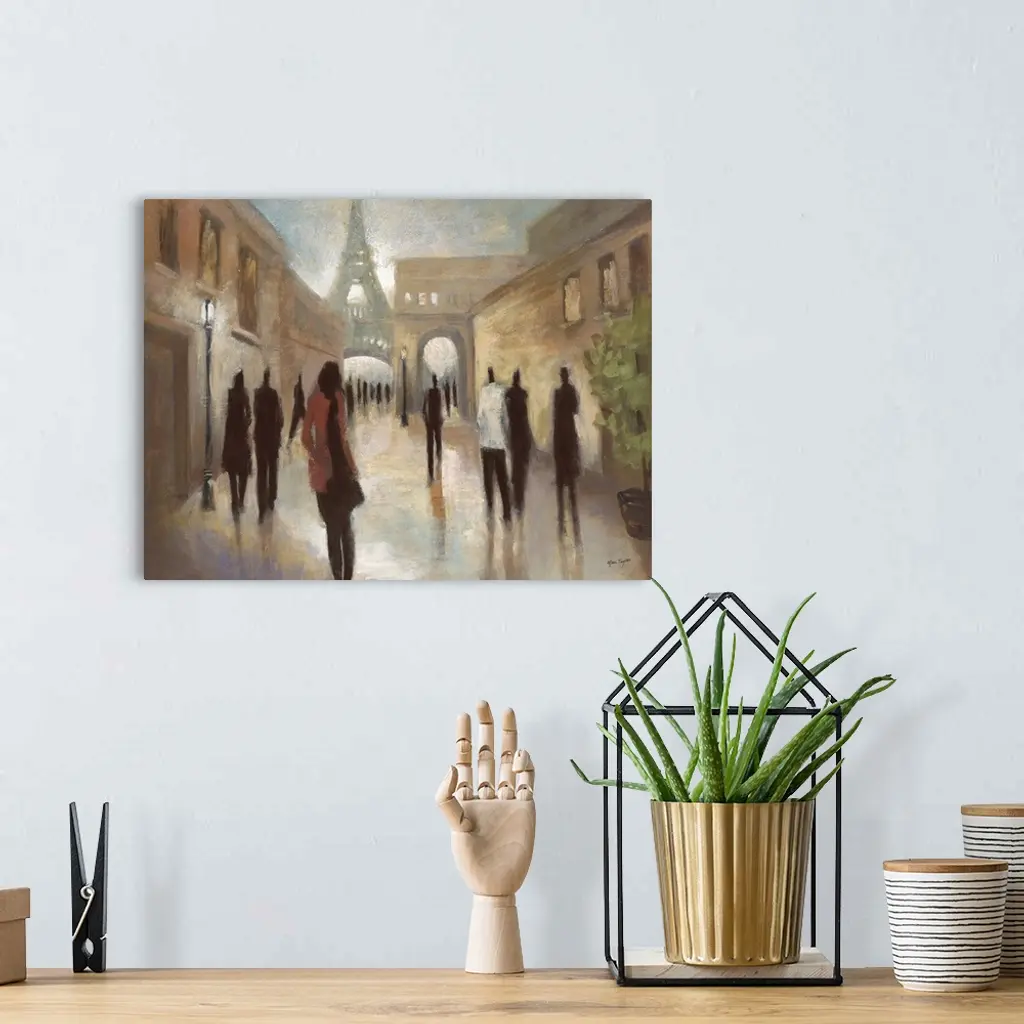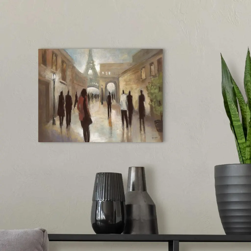 Contemporary painting of elongated figures walking along a Parisian street, with the Eiffel Tower in the background.