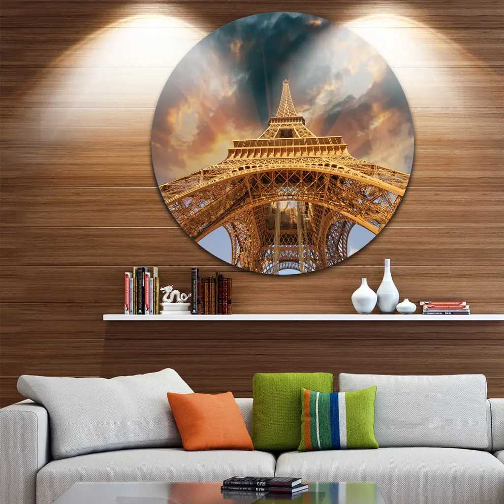 Bring Contemporary Abstraction to your home with this large Circle Metal wall art. This Paris Eiffel Tower in Paris with Sunset Colors Metal Artwork makes it the focal point of any room or office. - White Gloss Coating ensures colors are extra vibrant with light reflection.- Aluminum grade Sheet Metal with 1 inch mounting frame on the back giving the illusion that the artwork is floating on the wall..- Mounting Brackets are included along with instructions.- High Quality Digital images are created directly into a glossy aluminum panel producing a stunning and captivating print into the glossy finish of the metal.- Water, Fire and Scratch resistant HD Aluminum panels.- Looks better than any photo paper and guaranteed to last at least 20 years- Easy to clean with a microfiber cloth. Colors are far superior to regular Canvas Art. - Easy to Hang