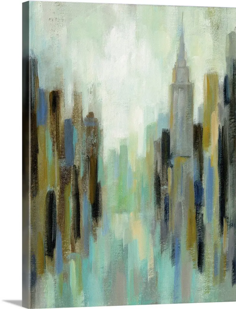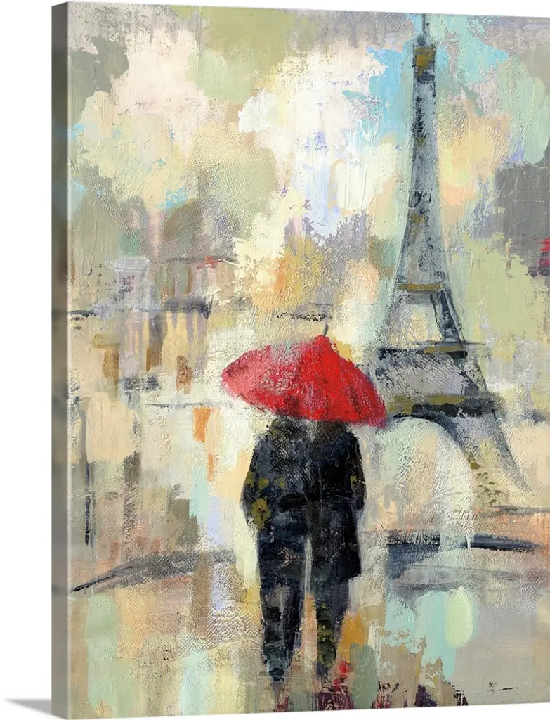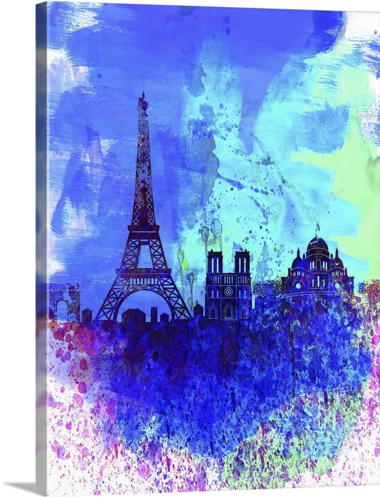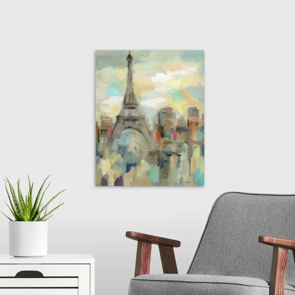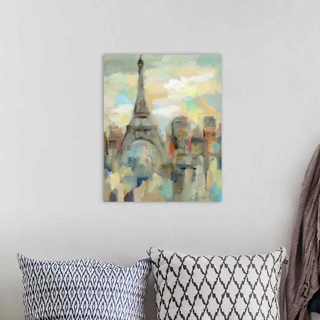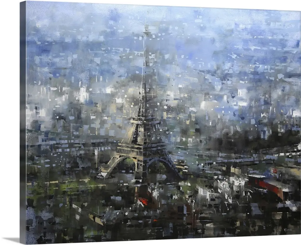 Cityscape painting of Paris, France painted in an impressionistic style with the Eiffel Tower on the left.