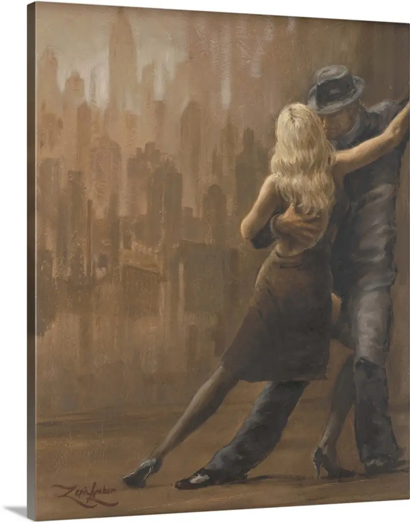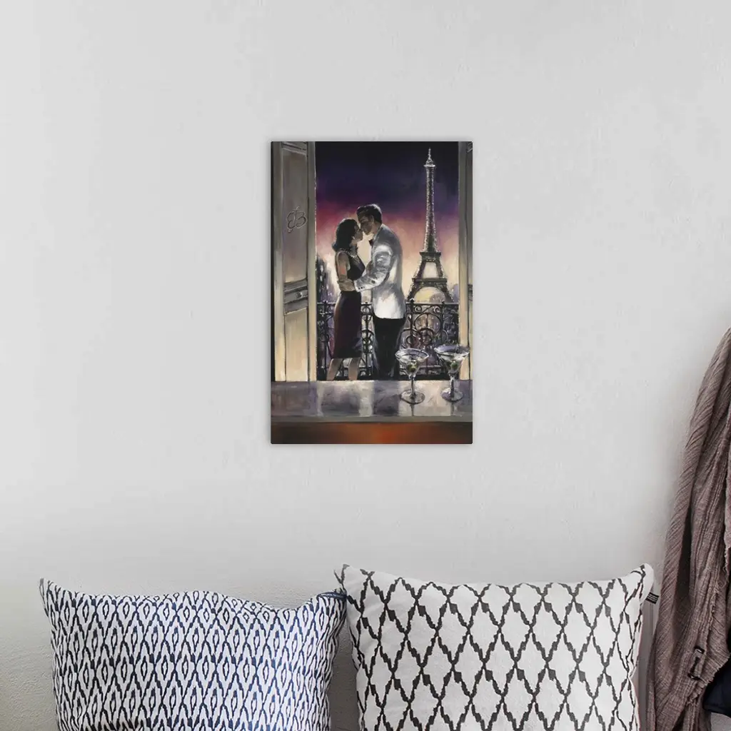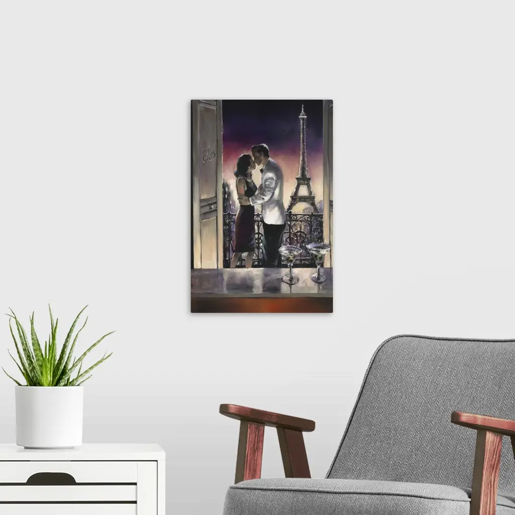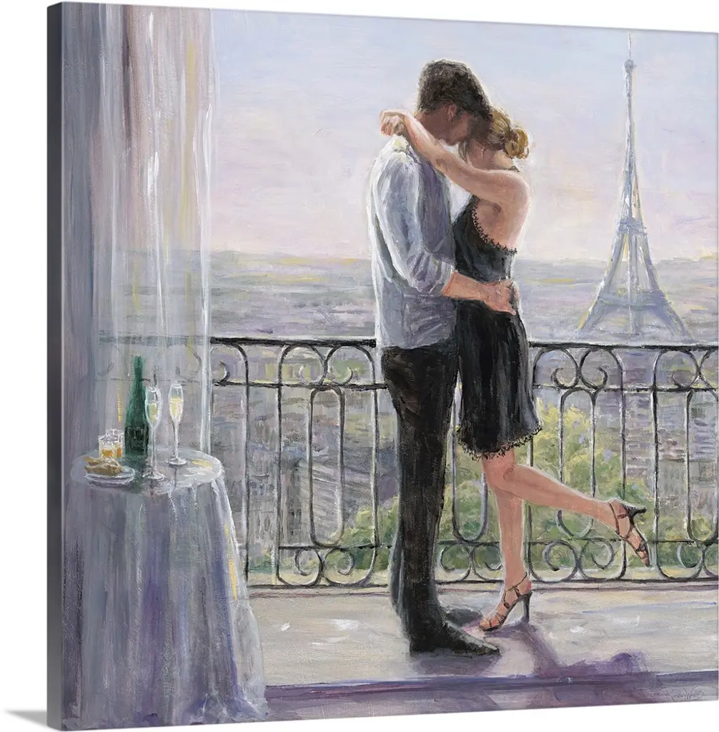 Contemporary painting of a man and woman sharing a kiss on a balcony with the Eiffel tower int he background.