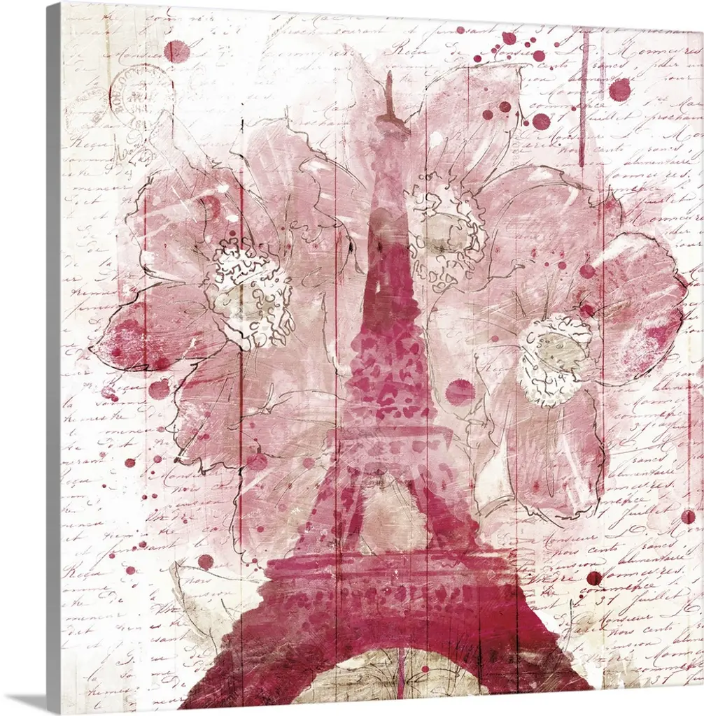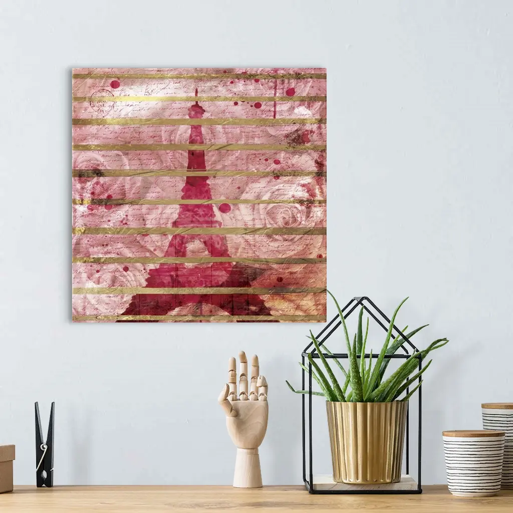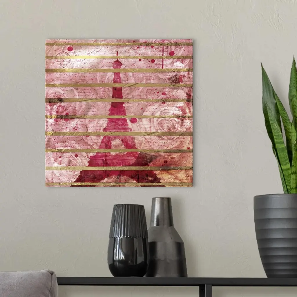 A pink watercolor painting of the Eiffel Tower on a background with pink roses and handwritten text with paint splatter and gold horizontal lines going across the front.