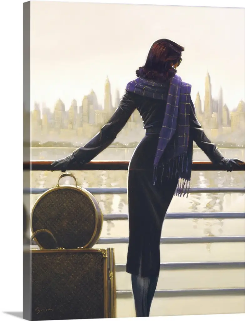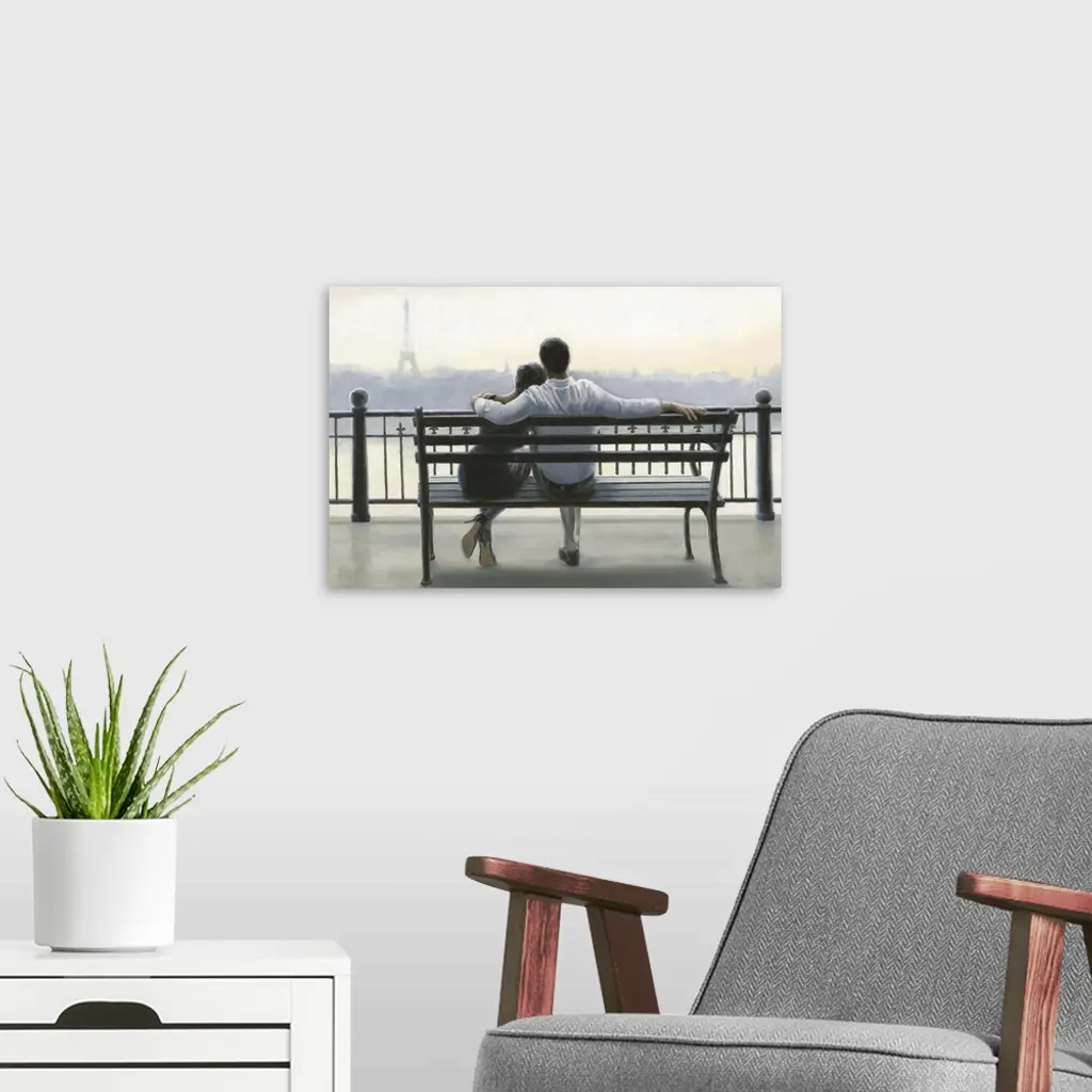 Contemporary painting of a couple sitting on a park bench gazing at the Paris cityscape.