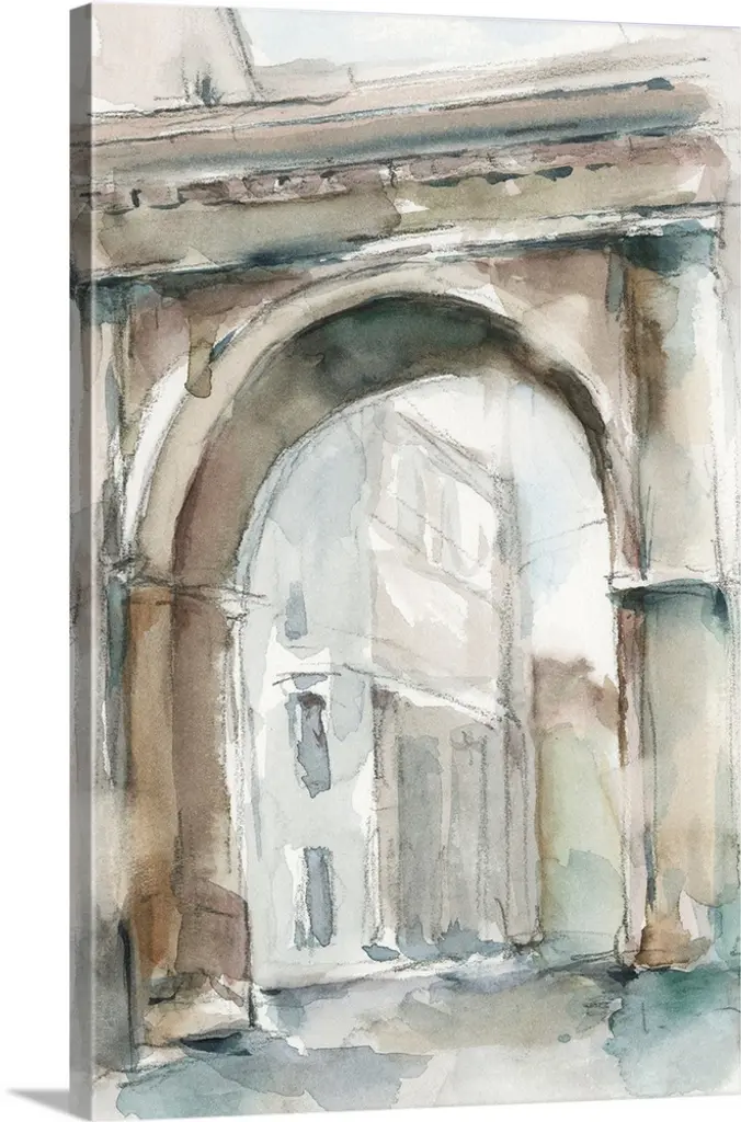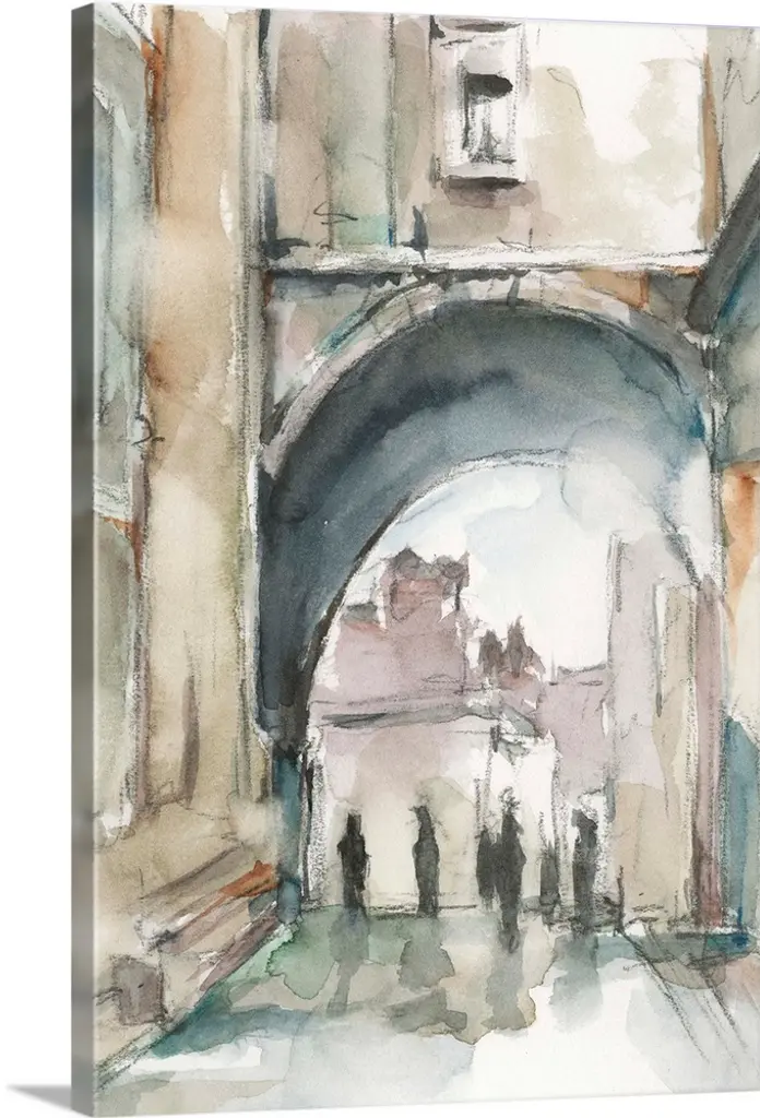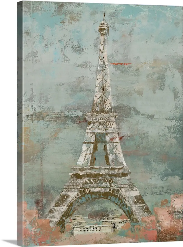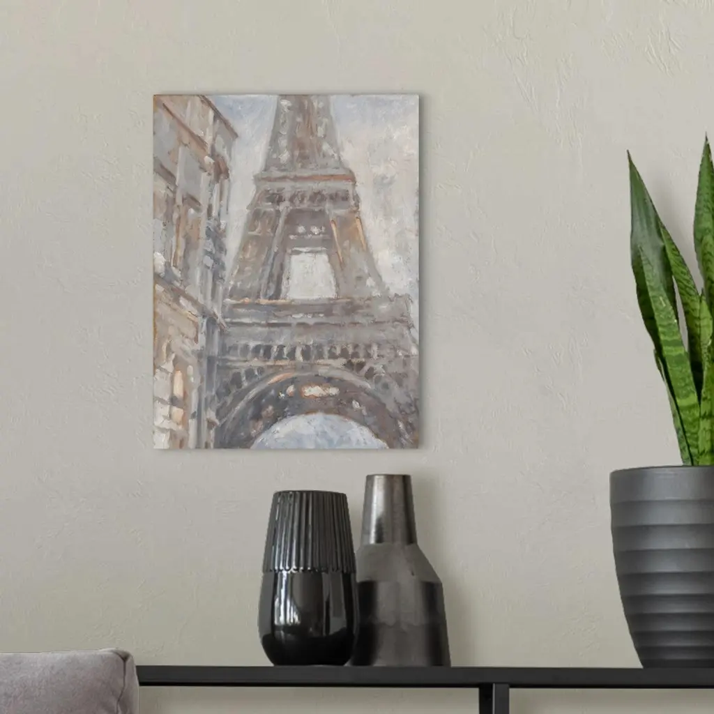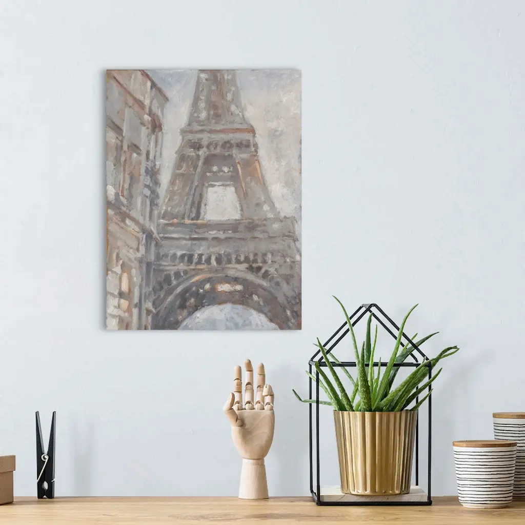 Obscure wide brush strokes illustrate the view of the Eiffel tower from the street in this vertical contemporary artwork.
