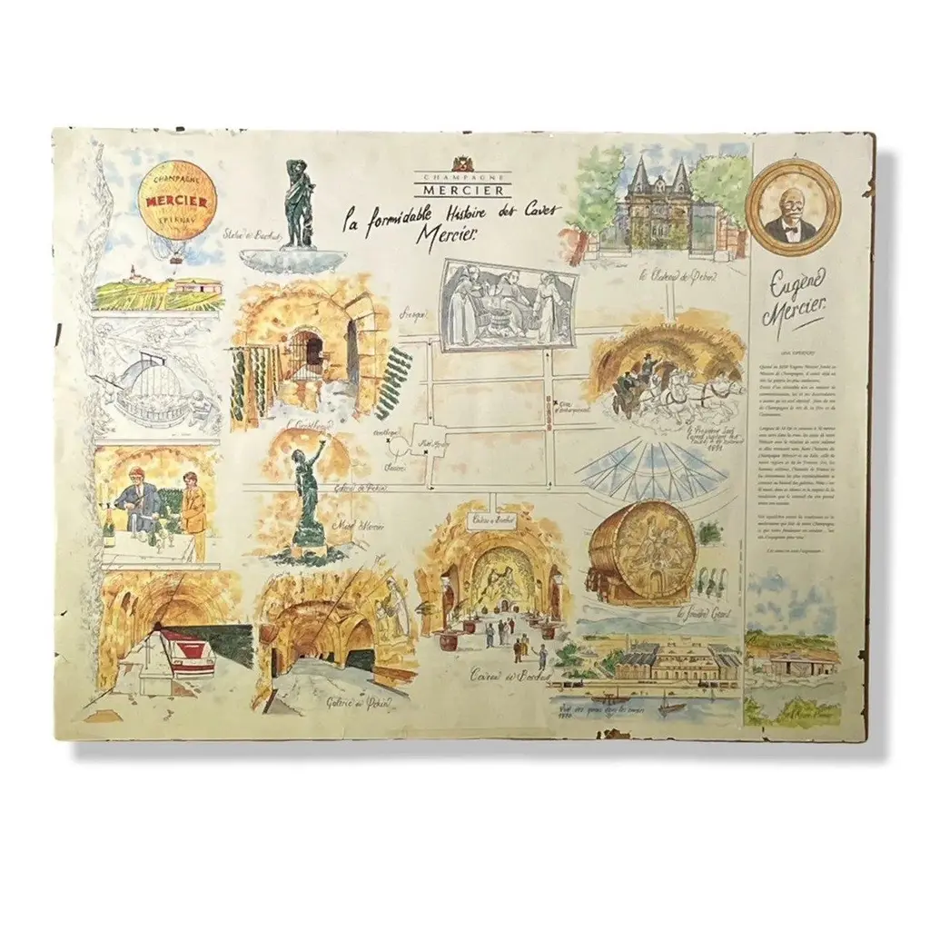 'La Formidable Histoire der Caves Mercier', 'The great story of Caves Mercier in Champagne'. A whimsical and truly Parisienne styled paper hand drawing, showcasing the history of Mercier, in the Champagne region, in story book type fine drawings. A perfect piece for ones cellar, this artwork was brought back to Australia by us on its original board, rather than rolling up the paper and damaging the piece. We found this stunning piece in Clignancourt, Northern Paris. The size of this product:Length: 80cmHeight: 60cm
