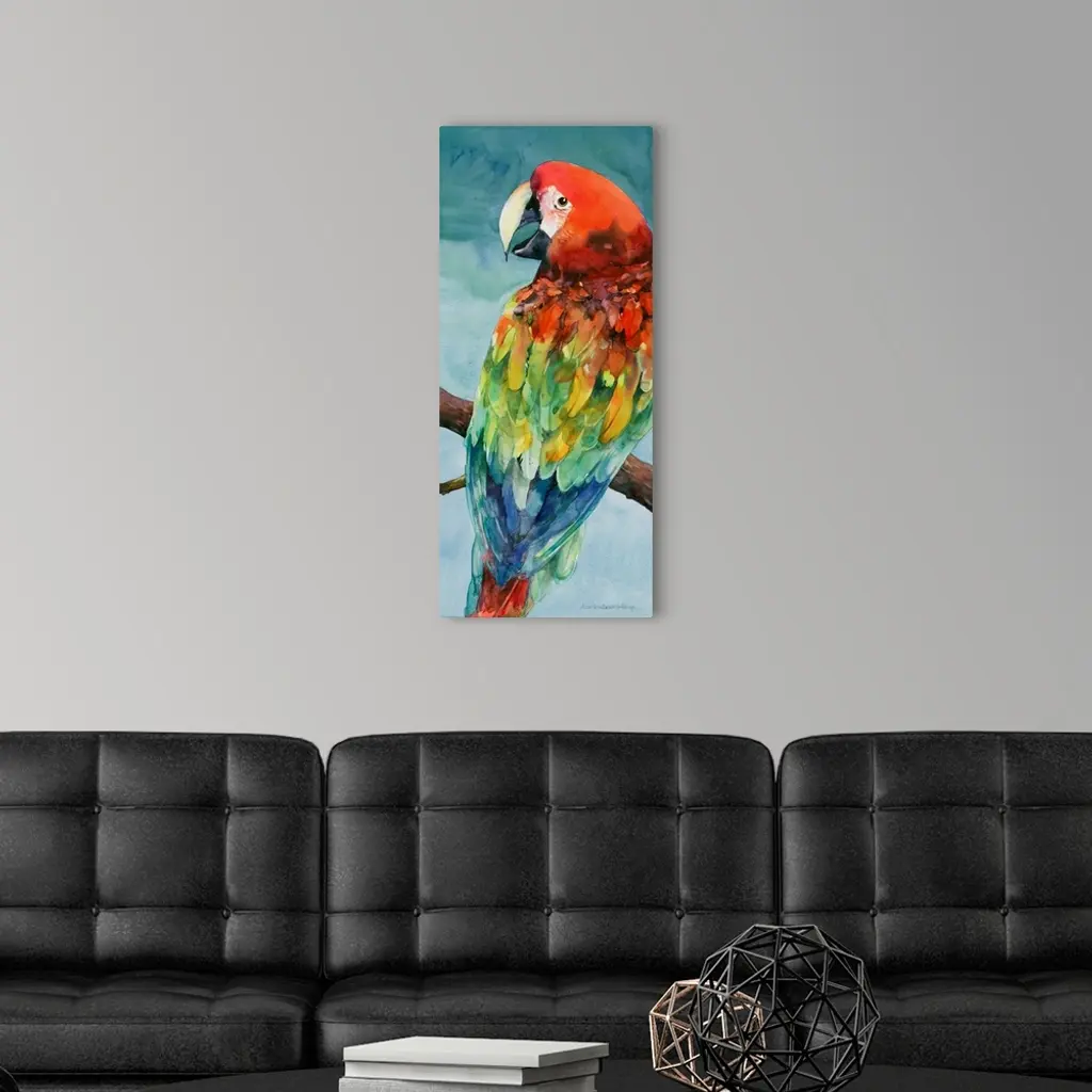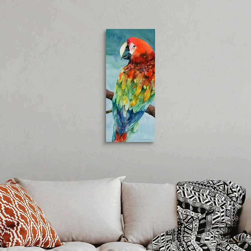 Contemporary watercolor painting of a vibrant colorful parrot perched on a branch.