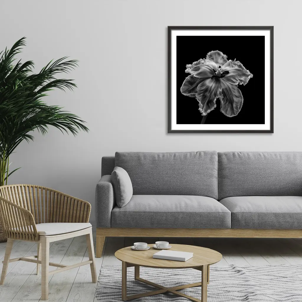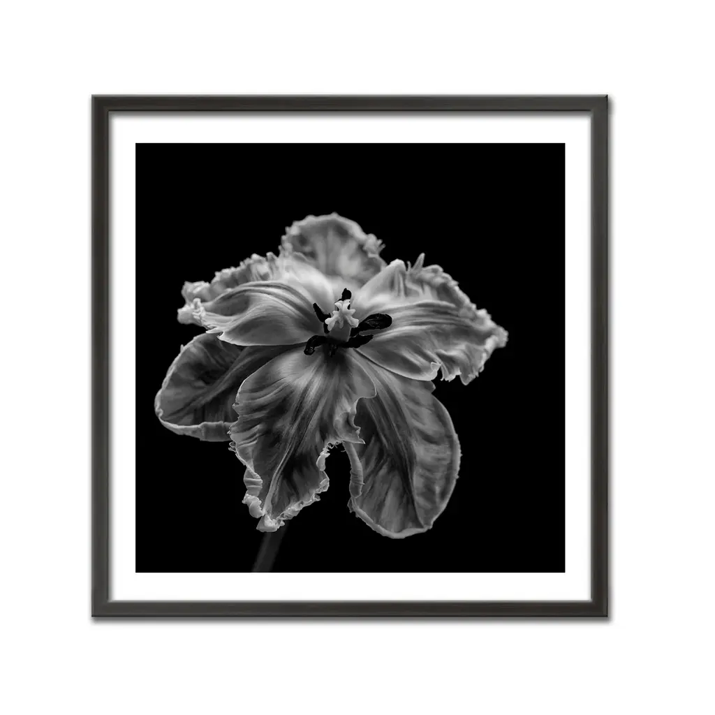Infuse any space with the essence of this beautifully captured framed print photograph titled "Parrot Tulip" by Lotte Gronkjar. This piece features a monochromatic up-close view of a blooming parrot tulip flower to complete any modern space. Handcrafted in Chattanooga, Tennessee, by Ready2HangArt using a locally sourced artist print, finished with a rear hanger for simple installation.