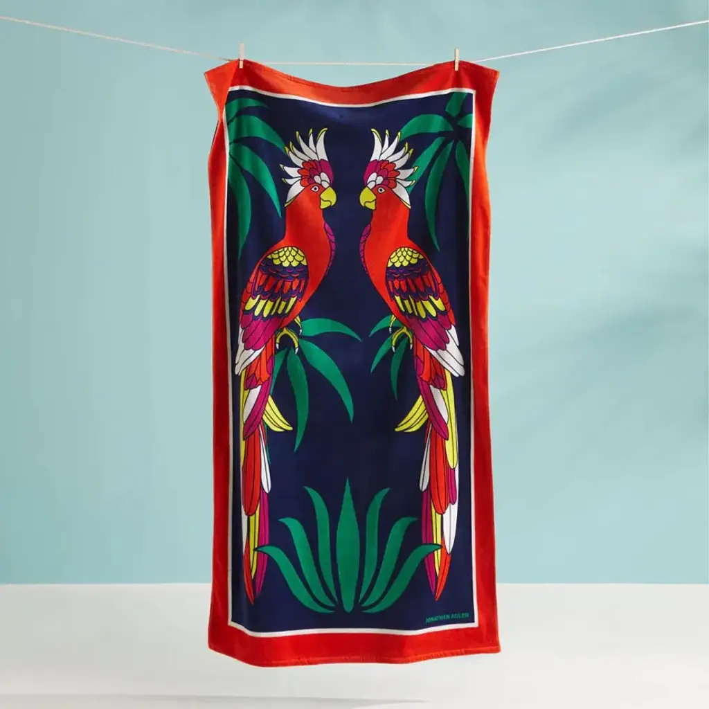 Channel the spirit of resort glamour with our generously sized, thick and thirsty beach towels. Featuring s a pair of preening island-flockers, our Parrots Beach Towel is trés chic tropical treat. White sand beach to infinity pool, they look as good draped across a chaise lounge as they do wrapped around your shoulders.