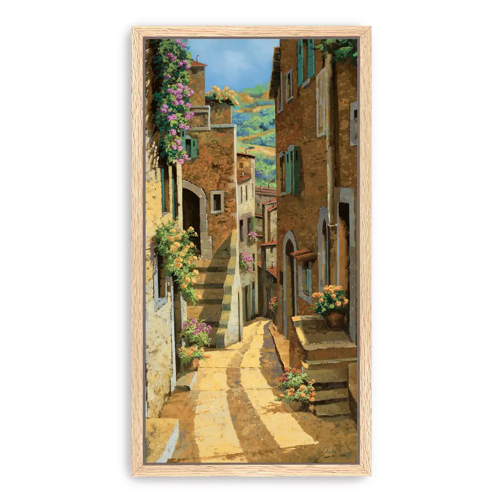 Bathed in golden light, this picturesque European street scene invites you into a tranquil world of rustic textures, flowering balconies, and scenic hillside vistas. It’s a nostalgic escape to a slower, more beautiful way of life. Our Gallery Wrap Canvas Prints are proudly assembled with high quality materials in California, USA. Each piece is printed on a thick, archival grade canvas using Giclee technology. It is then hand-stretched by our experienced artisans over solid wood bars, which will not warp over time. The final product is a piece personally crafted for you to confidently display on your wall. Care and Assembly: Ensure that the location of your piece has little to no exposure to heat, sunlight, and moisture. Wipe clean, only if needed. Each piece includes hanging hardware to hang on your wall vertically.
