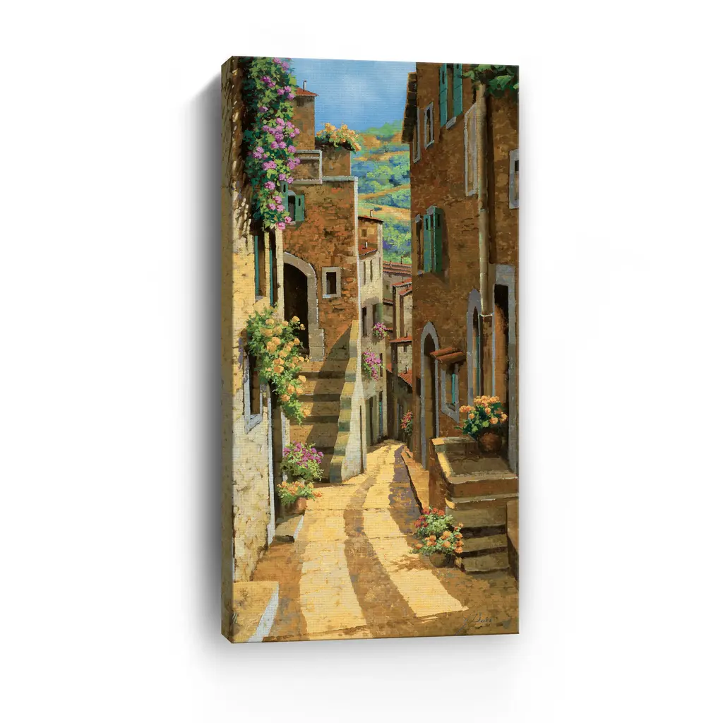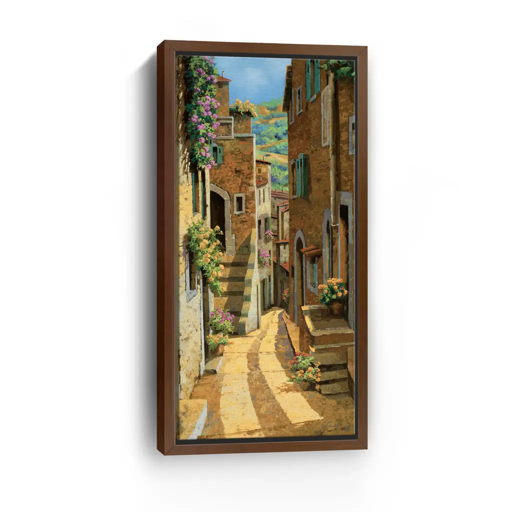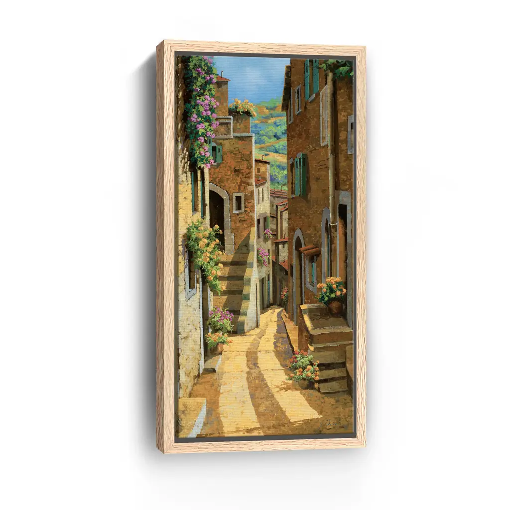 Bathed in golden light, this picturesque European street scene invites you into a tranquil world of rustic textures, flowering balconies, and scenic hillside vistas. It’s a nostalgic escape to a slower, more beautiful way of life. Our Gallery Wrap Canvas Prints are proudly assembled with high quality materials in California, USA. Each piece is printed on a thick, archival grade canvas using Giclee technology. It is then hand-stretched by our experienced artisans over solid wood bars, which will not warp over time. The final product is a piece personally crafted for you to confidently display on your wall. Care and Assembly: Ensure that the location of your piece has little to no exposure to heat, sunlight, and moisture. Wipe clean, only if needed. Each piece includes hanging hardware to hang on your wall vertically.