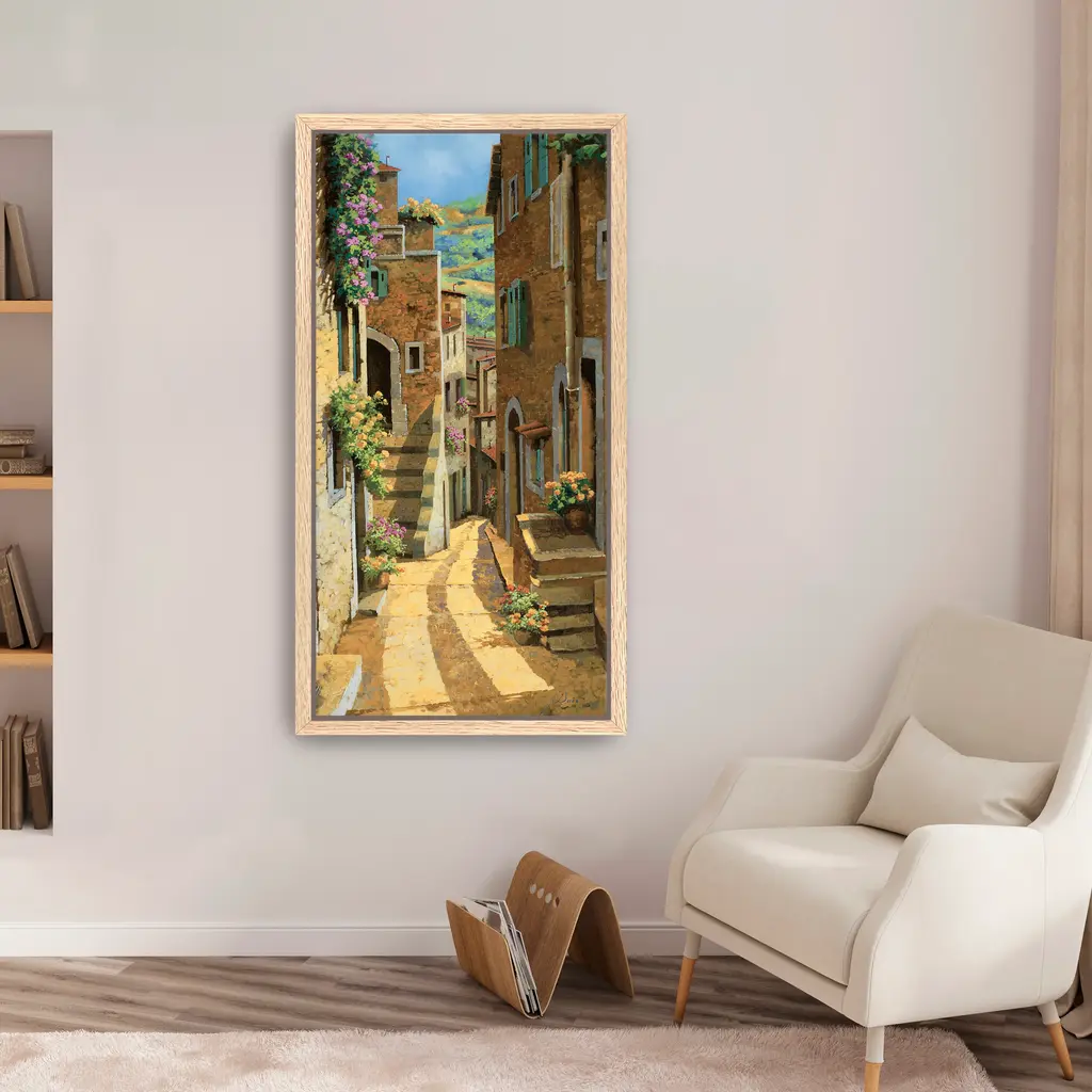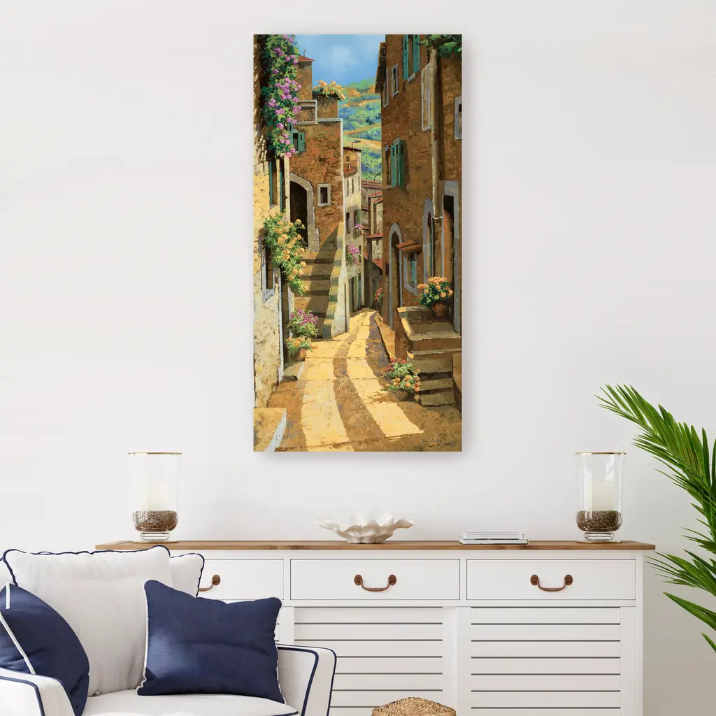 Bathed in golden light, this picturesque European street scene invites you into a tranquil world of rustic textures, flowering balconies, and scenic hillside vistas. It’s a nostalgic escape to a slower, more beautiful way of life. Our Gallery Wrap Canvas Prints are proudly assembled with high quality materials in California, USA. Each piece is printed on a thick, archival grade canvas using Giclee technology. It is then hand-stretched by our experienced artisans over solid wood bars, which will not warp over time. The final product is a piece personally crafted for you to confidently display on your wall. Care and Assembly: Ensure that the location of your piece has little to no exposure to heat, sunlight, and moisture. Wipe clean, only if needed. Each piece includes hanging hardware to hang on your wall vertically.
