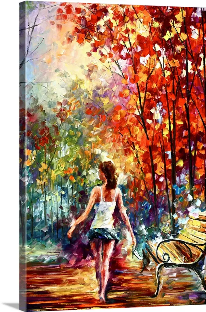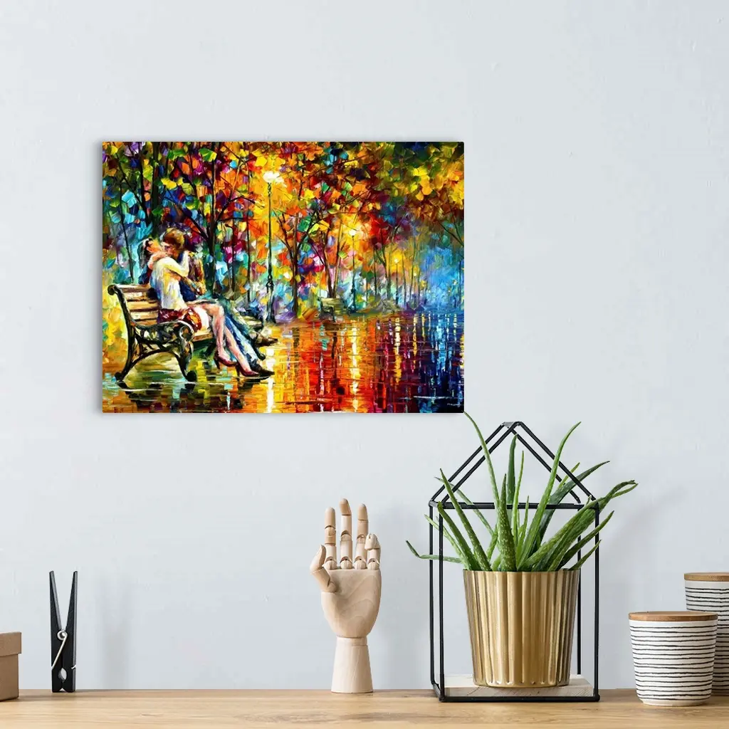 Classical painting of couple kissing on park bench at night after a rain. The bench is on a stone path lined by colorful trees and street lamps that are reflected in the wet pavement.