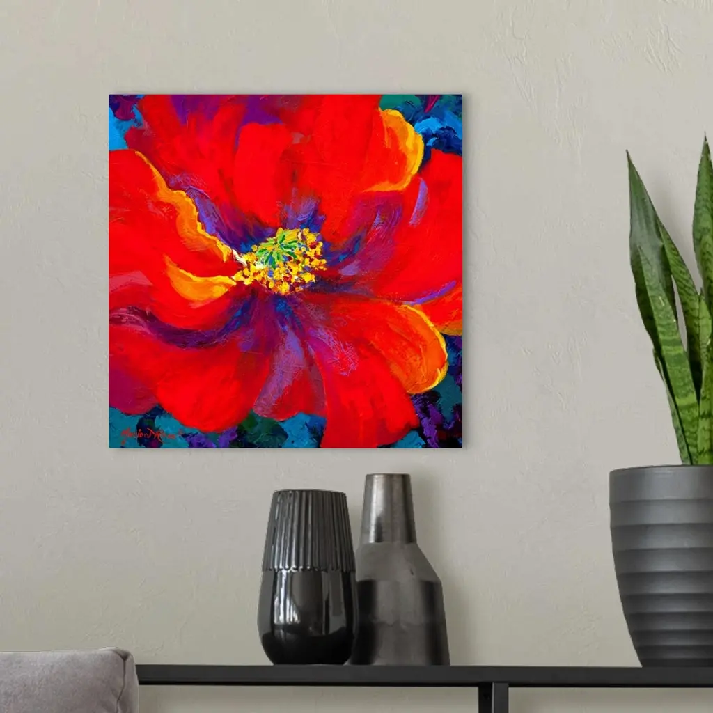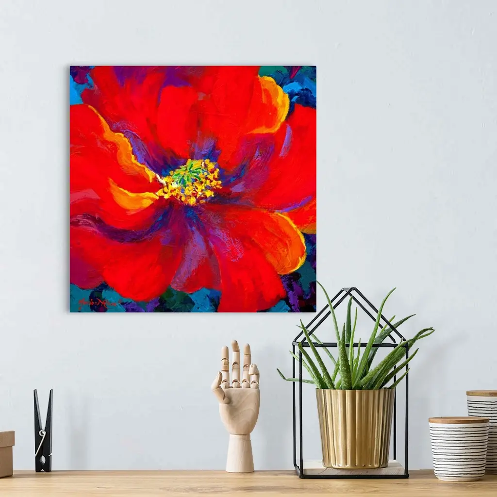 A contemporary artwork piece of a large red flower with accents of colors painted within it and a blue background.