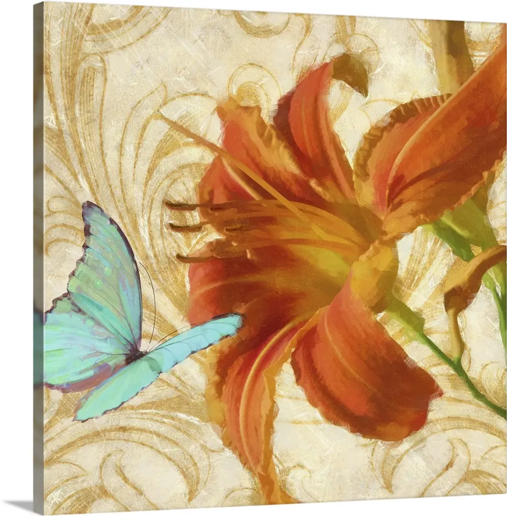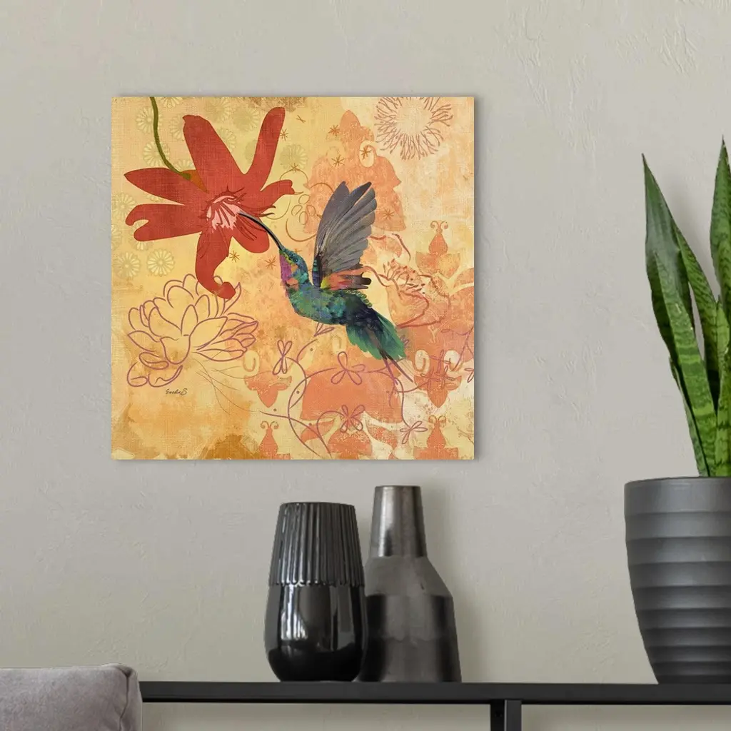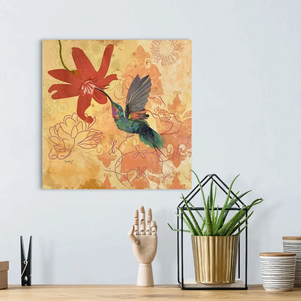 Artwork of a bright green hummingbird hovering up to a flower, against a rustic floral background.