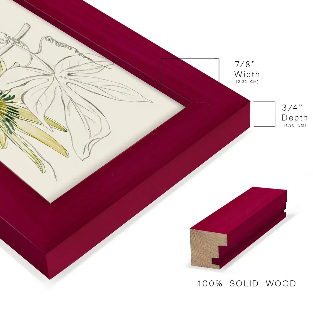 Passionflower I -EZ SWITCH Framed Print w/glass-Cherry Red A delightful, framed print. Featuring a solid wood frame with real wood glass. This premium print is giclee quality. In addition, every frame features a removable back and table top stand. This allows you to change your art in the future or to just stand the art on a table for a new look. We are sure you'll enjoy our new series of EZ SWITCH Framed Art. Solid Wood Frame Real Glass Removable / Replaceable Art Built in Tabletop Stand Sizes range from 4x6 up to 12x15 - buy just one or pair them up as sets as you see fit.