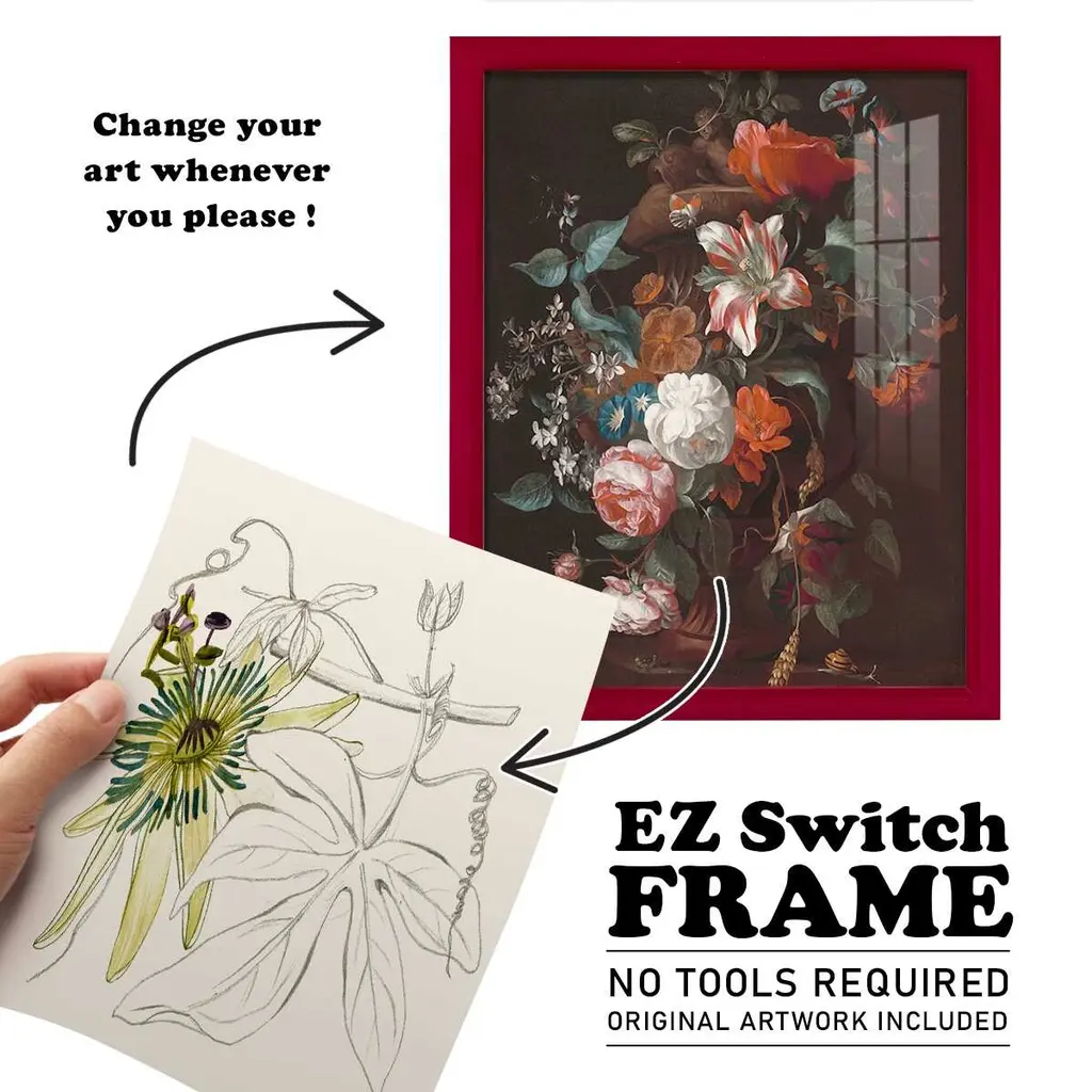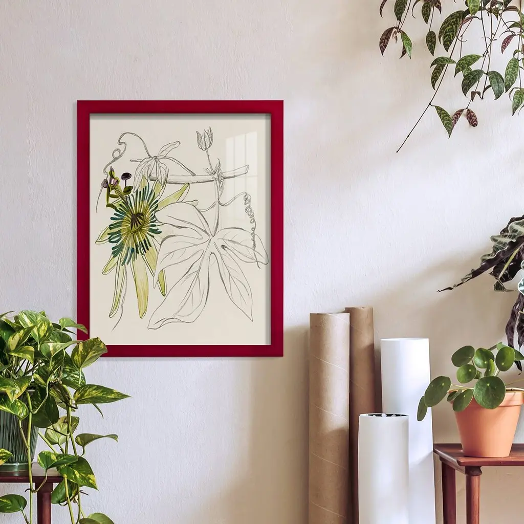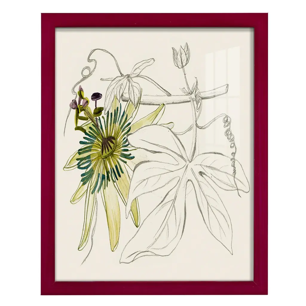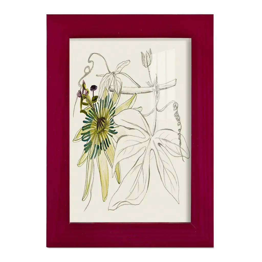 Passionflower I -EZ SWITCH Framed Print w/glass-Cherry Red A delightful, framed print. Featuring a solid wood frame with real wood glass. This premium print is giclee quality. In addition, every frame features a removable back and table top stand. This allows you to change your art in the future or to just stand the art on a table for a new look. We are sure you'll enjoy our new series of EZ SWITCH Framed Art. Solid Wood Frame Real Glass Removable / Replaceable Art Built in Tabletop Stand Sizes range from 4x6 up to 12x15 - buy just one or pair them up as sets as you see fit.