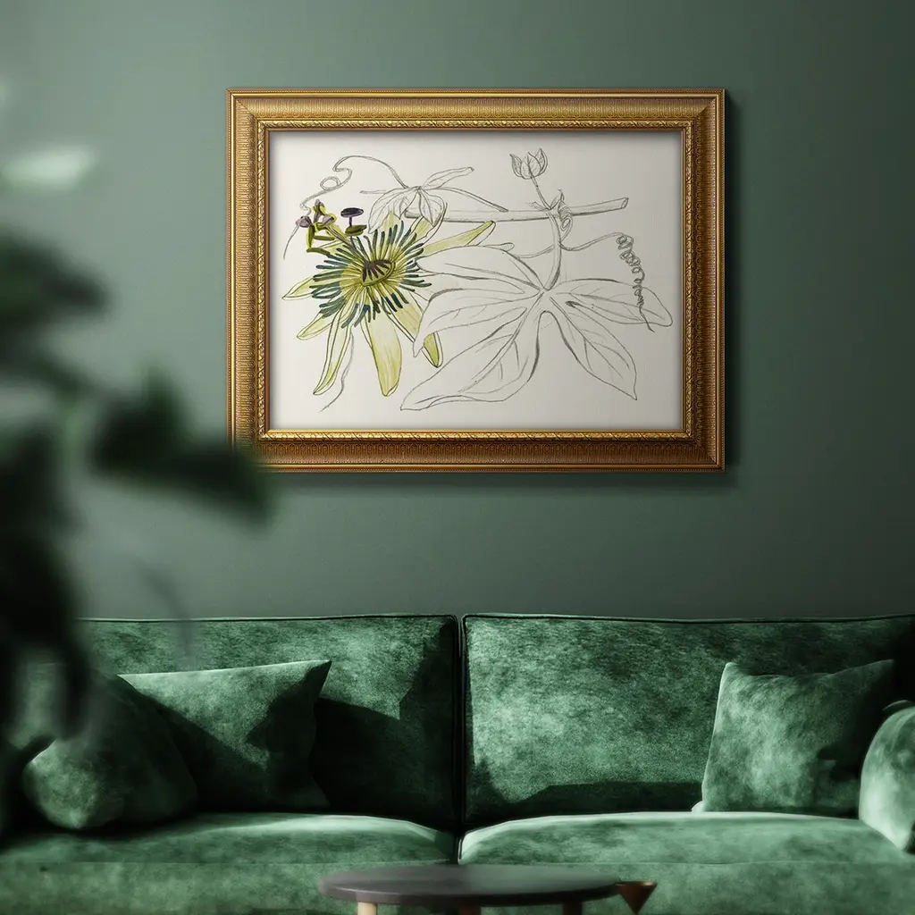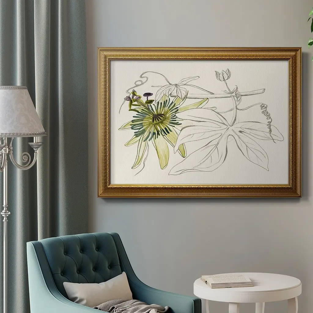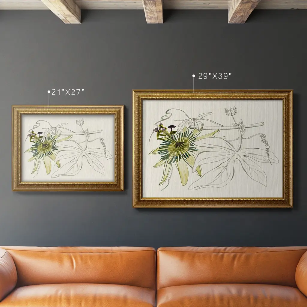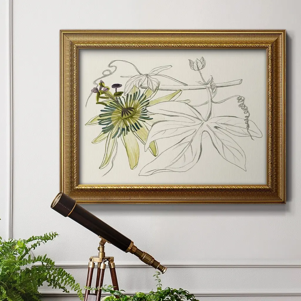 Passionflower I Premium Framed Canvas- Ready to Hang A Premium Framed Canvas created to last. Framed in distressed wood and available in an array of sizes and colors Featuring a beveled a solid wood stretcher bar, each piece comes ready to hand 3 SIZES AVAILABLE 16''X20'' - Overall Size 18'X27'' - Overall Size 24''x36'' - Overall Size Each piece is made to order. Each piece comes with hanging hardware. Made in the USA Ready to Hang Giclee Paper Print Acrylic Glass Beveled Matt Board