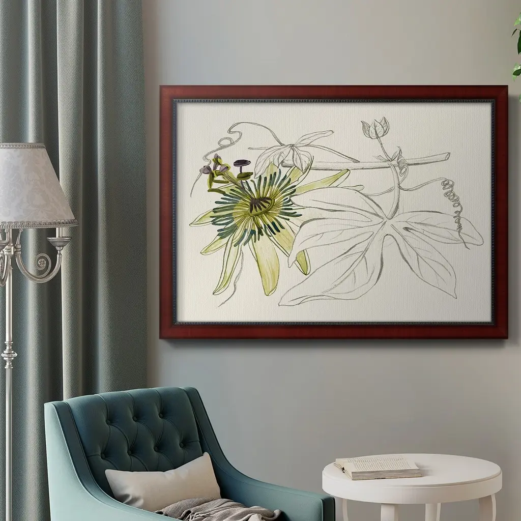 Passionflower I Premium Framed Canvas- Ready to Hang A Premium Framed Canvas created to last. Framed in distressed wood and available in an array of sizes and colors Featuring a beveled a solid wood stretcher bar, each piece comes ready to hand 3 SIZES AVAILABLE 16''X20'' - Overall Size 18'X27'' - Overall Size 24''x36'' - Overall Size Each piece is made to order. Each piece comes with hanging hardware. Made in the USA Ready to Hang Giclee Paper Print Acrylic Glass Beveled Matt Board