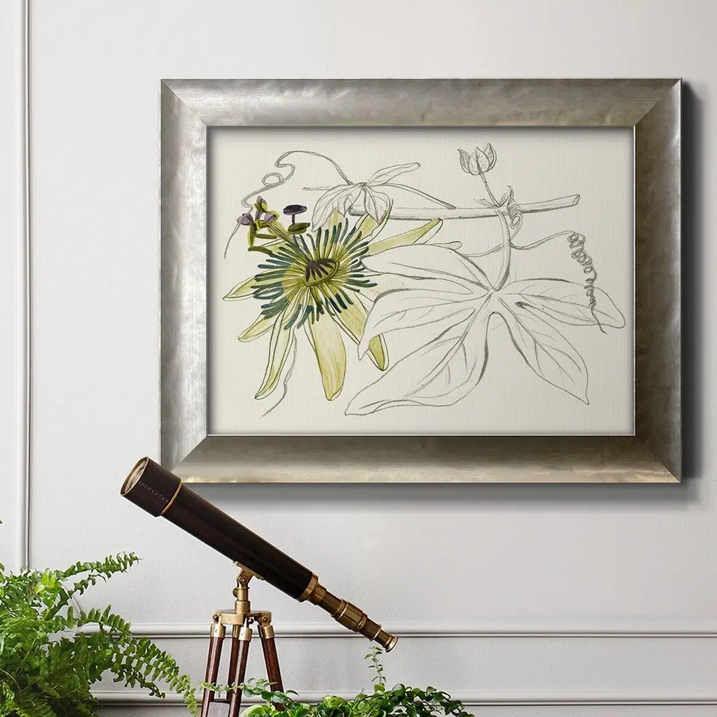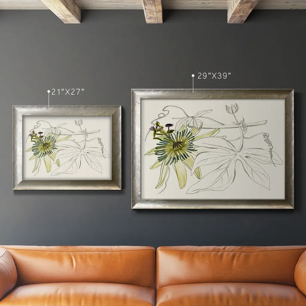 Passionflower I Premium Framed Canvas- Ready to Hang A Premium Framed Canvas created to last. Framed in distressed wood and available in an array of sizes and colors Featuring a beveled a solid wood stretcher bar, each piece comes ready to hand 3 SIZES AVAILABLE 16''X20'' - Overall Size 18'X27'' - Overall Size 24''x36'' - Overall Size Each piece is made to order. Each piece comes with hanging hardware. Made in the USA Ready to Hang Giclee Paper Print Acrylic Glass Beveled Matt Board
