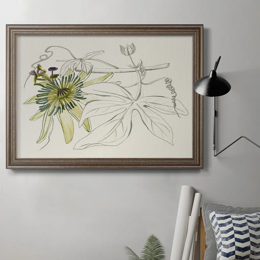 Passionflower I Premium Framed Canvas- Ready to Hang A Premium Framed Canvas created to last. Framed in distressed wood and available in an array of sizes and colors Featuring a beveled a solid wood stretcher bar, each piece comes ready to hand 3 SIZES AVAILABLE 16''X20'' - Overall Size 18'X27'' - Overall Size 24''x36'' - Overall Size Each piece is made to order. Each piece comes with hanging hardware. Made in the USA Ready to Hang Giclee Paper Print Acrylic Glass Beveled Matt Board