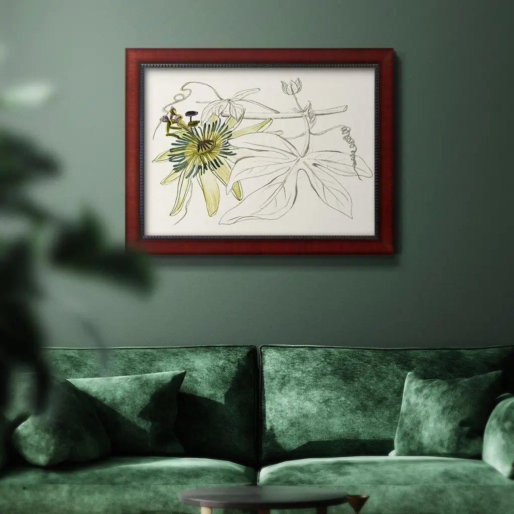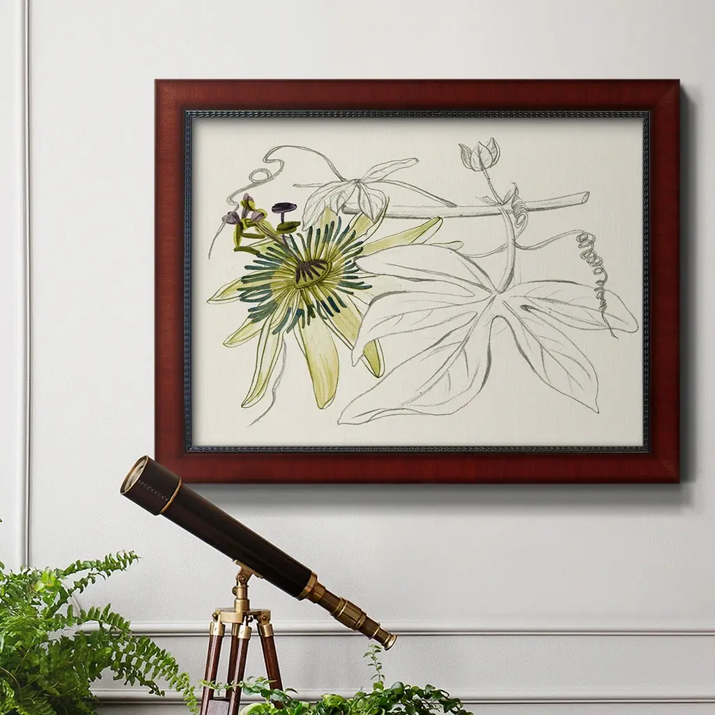 Passionflower I Premium Framed Canvas- Ready to Hang A Premium Framed Canvas created to last. Framed in distressed wood and available in an array of sizes and colors Featuring a beveled a solid wood stretcher bar, each piece comes ready to hand 3 SIZES AVAILABLE 16''X20'' - Overall Size 18'X27'' - Overall Size 24''x36'' - Overall Size Each piece is made to order. Each piece comes with hanging hardware. Made in the USA Ready to Hang Giclee Paper Print Acrylic Glass Beveled Matt Board