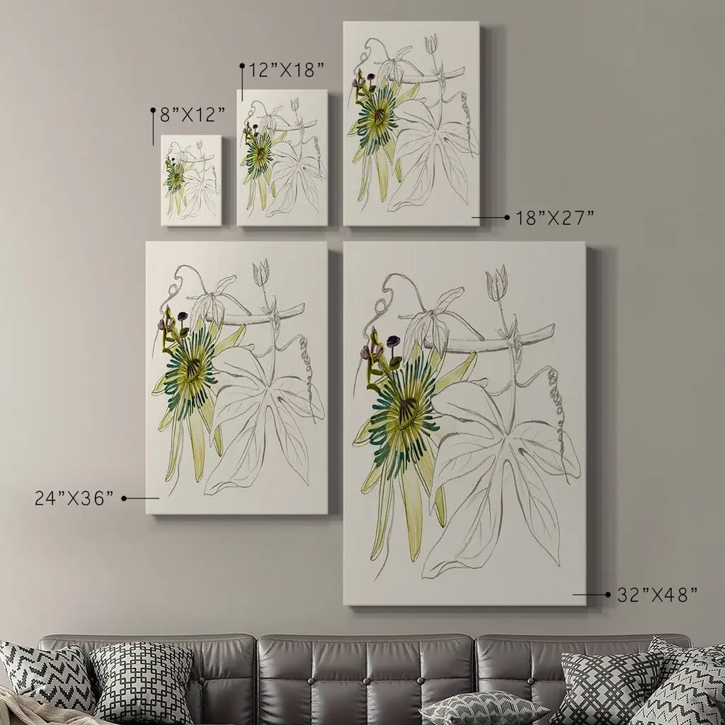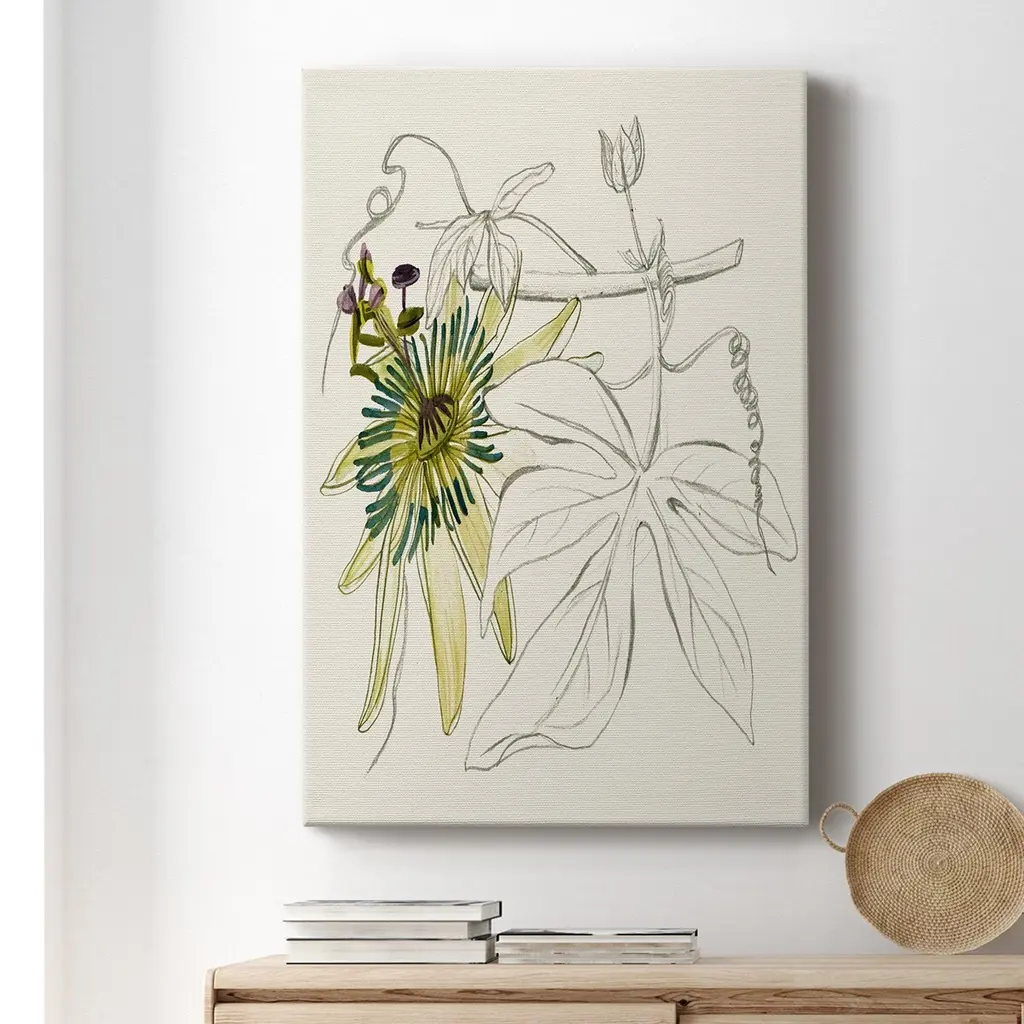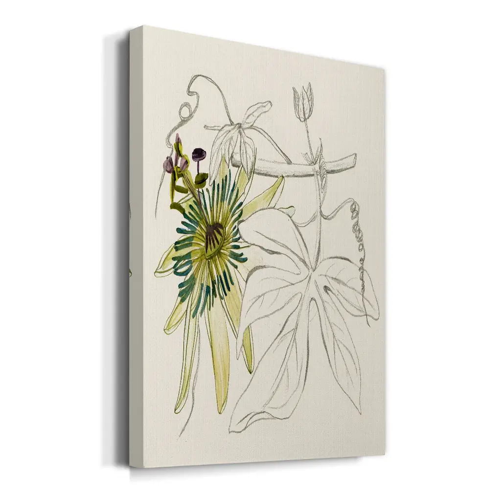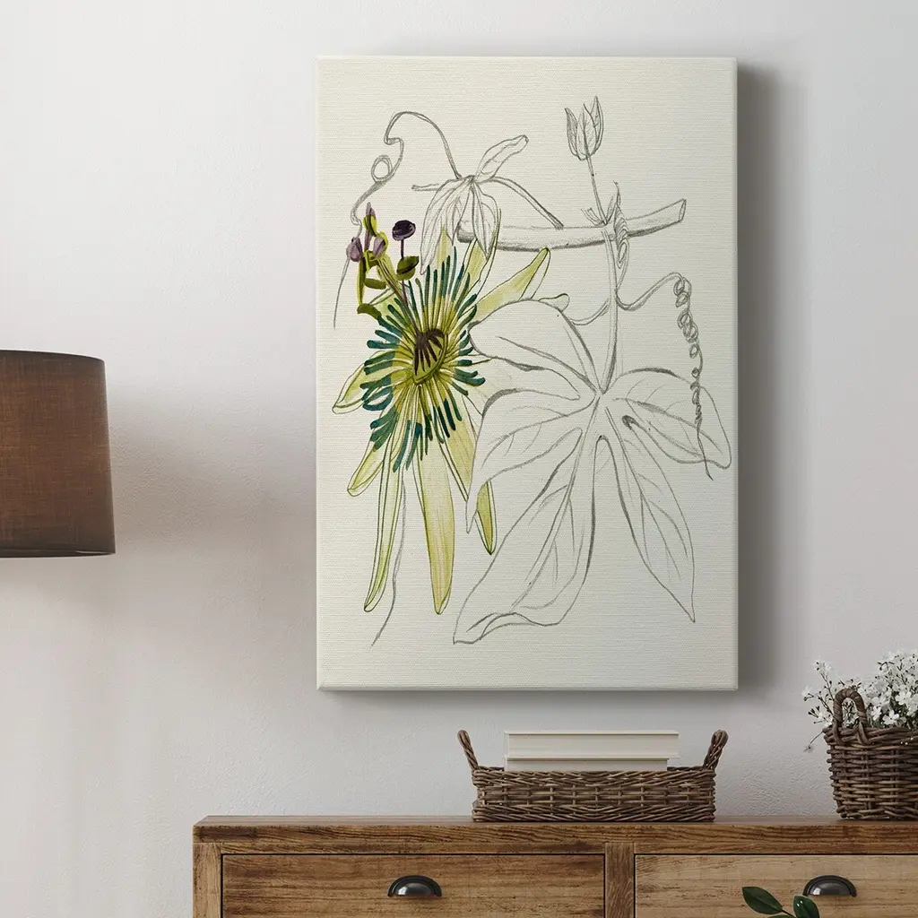 Passionflower I Premium Gallery Wrapped Canvas - Ready to Hang A premium hand stretched gallery wrapped canvas print created to last. Featuring a beveled a solid wood stretcher bar, each piece comes ready to hand 6 SIZES AVAILABLE 8''X12'' - Overall Size 12''X18'' - Overall Size 18''X27'' - Overall Size 24''x36'' - Overall Size 32''x48'' - Overall Size 40''x60'' - Overall Size Each piece is made to order. Built to Last Each piece comes ready to hang Solid wood stretcher Fade and Water resistant Made domestically