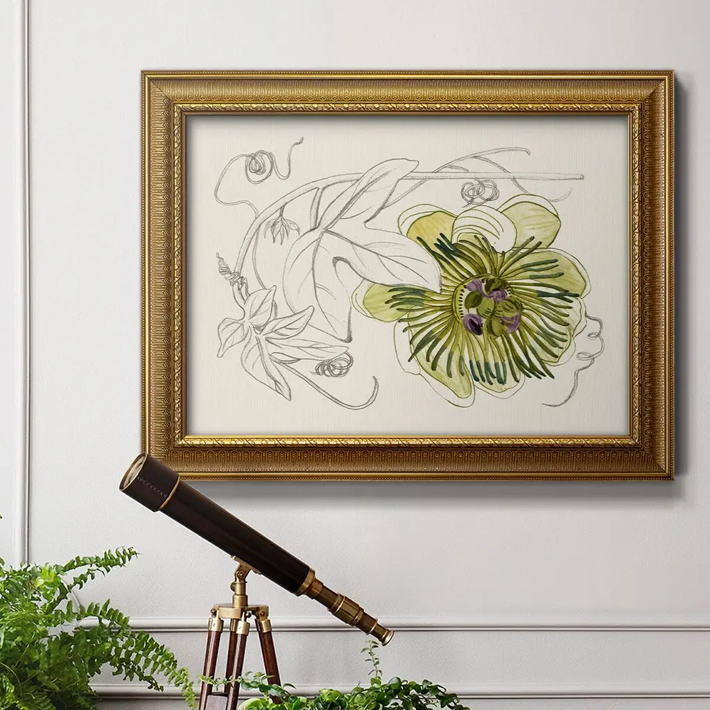 Passionflower II Premium Framed Canvas- Ready to Hang A Premium Framed Canvas created to last. Framed in distressed wood and available in an array of sizes and colors Featuring a beveled a solid wood stretcher bar, each piece comes ready to hand 3 SIZES AVAILABLE 16''X20'' - Overall Size 18'X27'' - Overall Size 24''x36'' - Overall Size Each piece is made to order. Each piece comes with hanging hardware. Made in the USA Ready to Hang Giclee Paper Print Acrylic Glass Beveled Matt Board