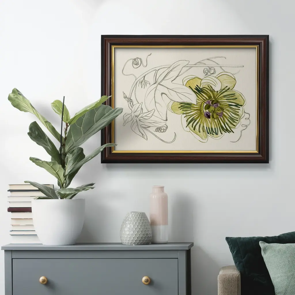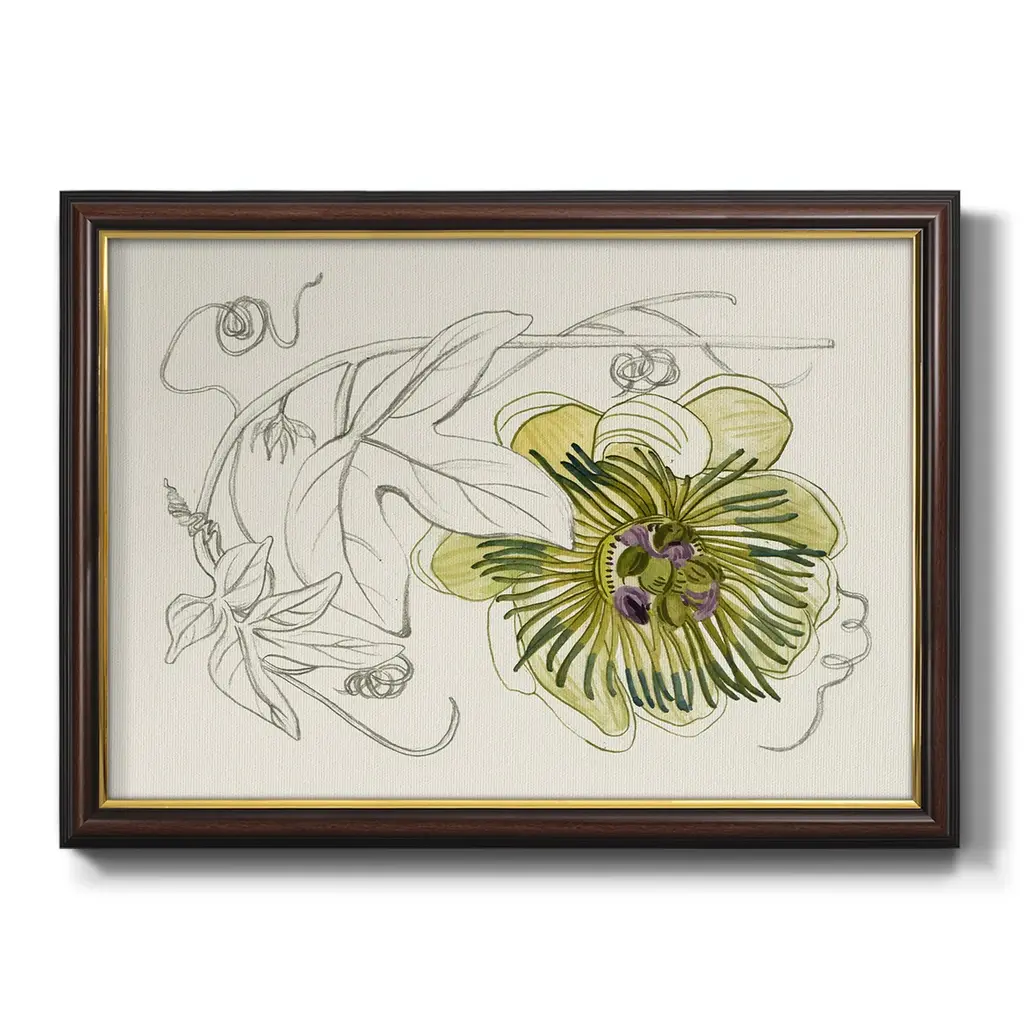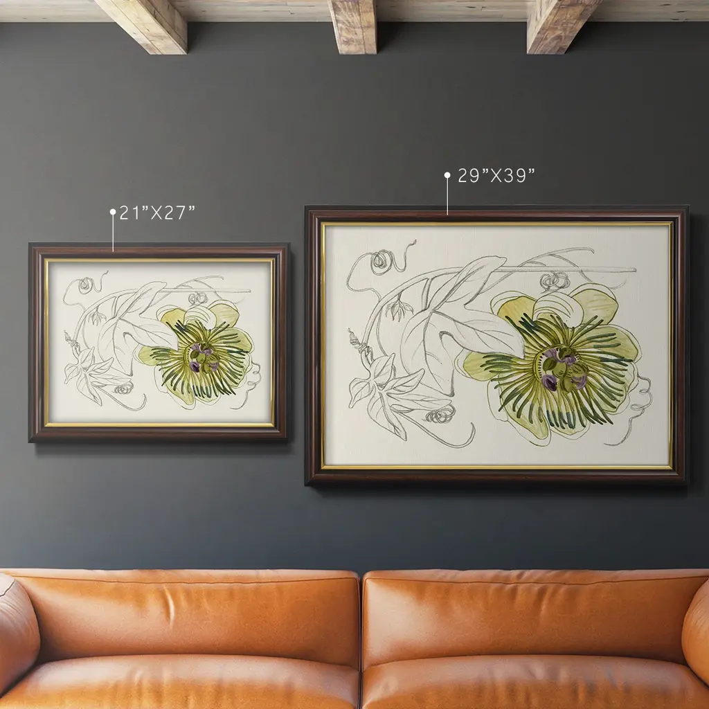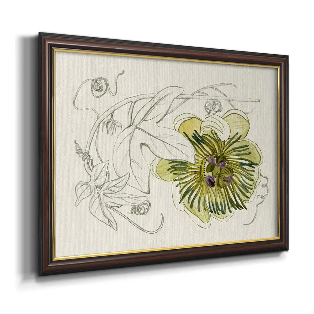 Passionflower II Premium Framed Canvas- Ready to Hang A Premium Framed Canvas created to last. Framed in distressed wood and available in an array of sizes and colors Featuring a beveled a solid wood stretcher bar, each piece comes ready to hand 3 SIZES AVAILABLE 16''X20'' - Overall Size 18'X27'' - Overall Size 24''x36'' - Overall Size Each piece is made to order. Each piece comes with hanging hardware. Made in the USA Ready to Hang Giclee Paper Print Acrylic Glass Beveled Matt Board