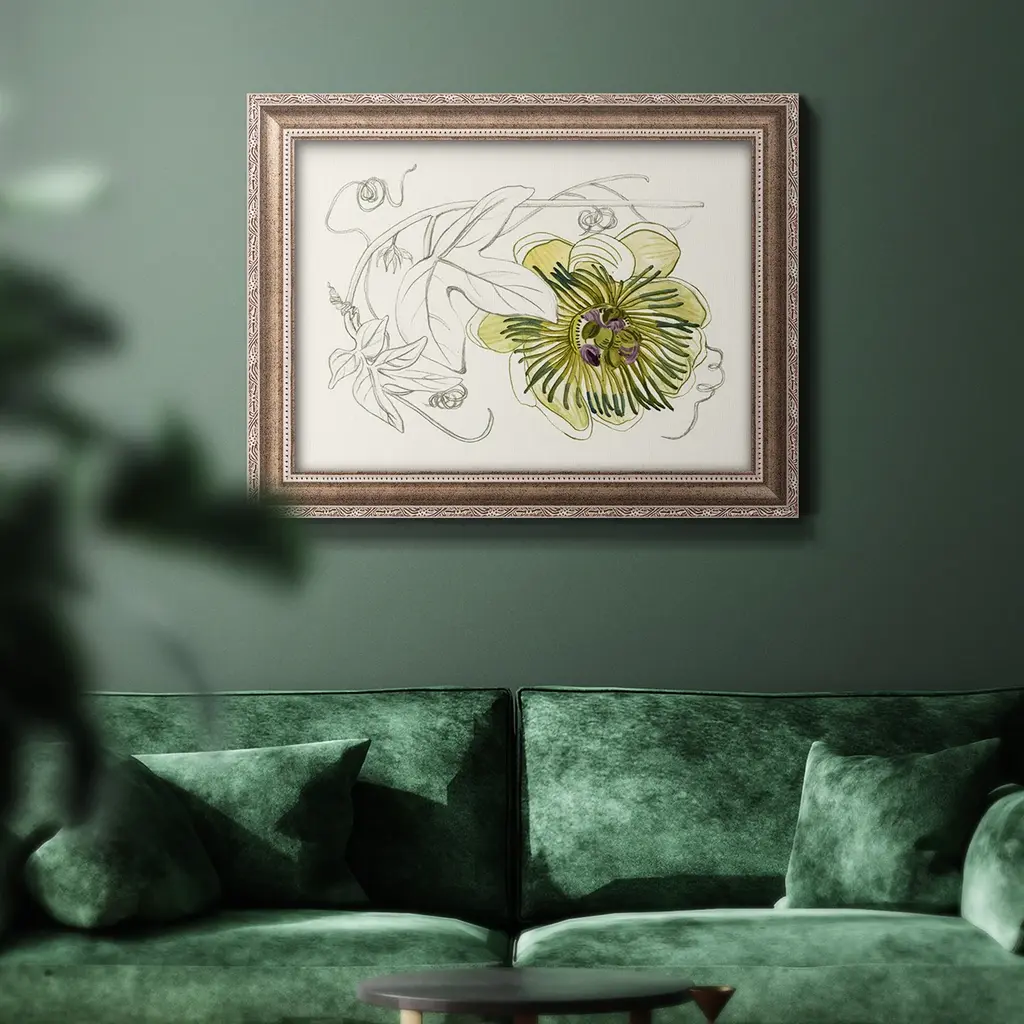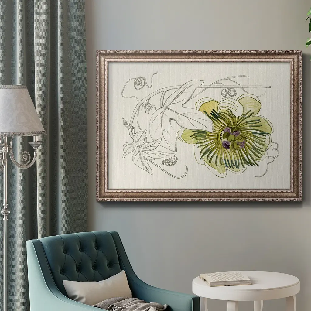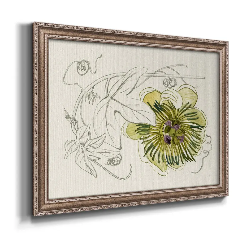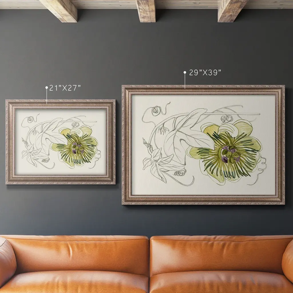 Passionflower II Premium Framed Canvas- Ready to Hang A Premium Framed Canvas created to last. Framed in distressed wood and available in an array of sizes and colors Featuring a beveled a solid wood stretcher bar, each piece comes ready to hand 3 SIZES AVAILABLE 16''X20'' - Overall Size 18'X27'' - Overall Size 24''x36'' - Overall Size Each piece is made to order. Each piece comes with hanging hardware. Made in the USA Ready to Hang Giclee Paper Print Acrylic Glass Beveled Matt Board