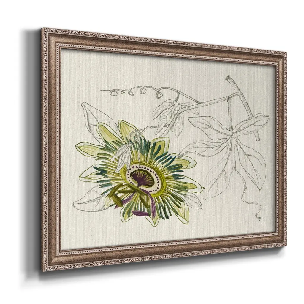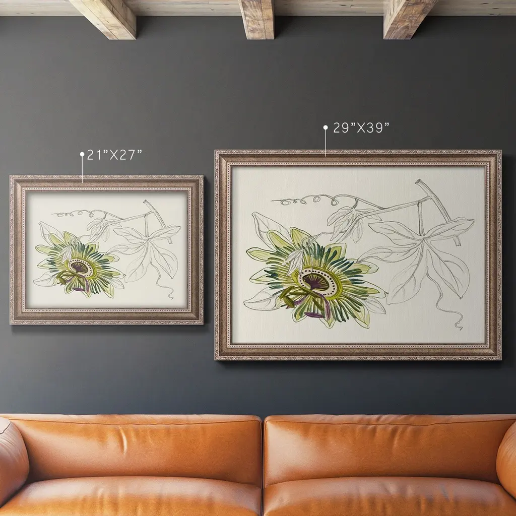 Passionflower III Premium Framed Canvas- Ready to Hang A Premium Framed Canvas created to last. Framed in distressed wood and available in an array of sizes and colors Featuring a beveled a solid wood stretcher bar, each piece comes ready to hand 3 SIZES AVAILABLE 16''X20'' - Overall Size 18'X27'' - Overall Size 24''x36'' - Overall Size Each piece is made to order. Each piece comes with hanging hardware. Made in the USA Ready to Hang Giclee Paper Print Acrylic Glass Beveled Matt Board
