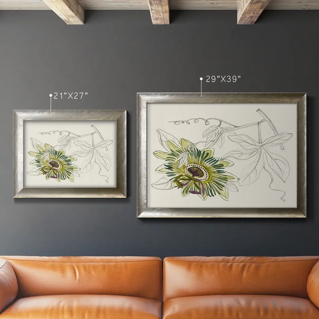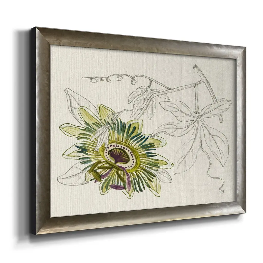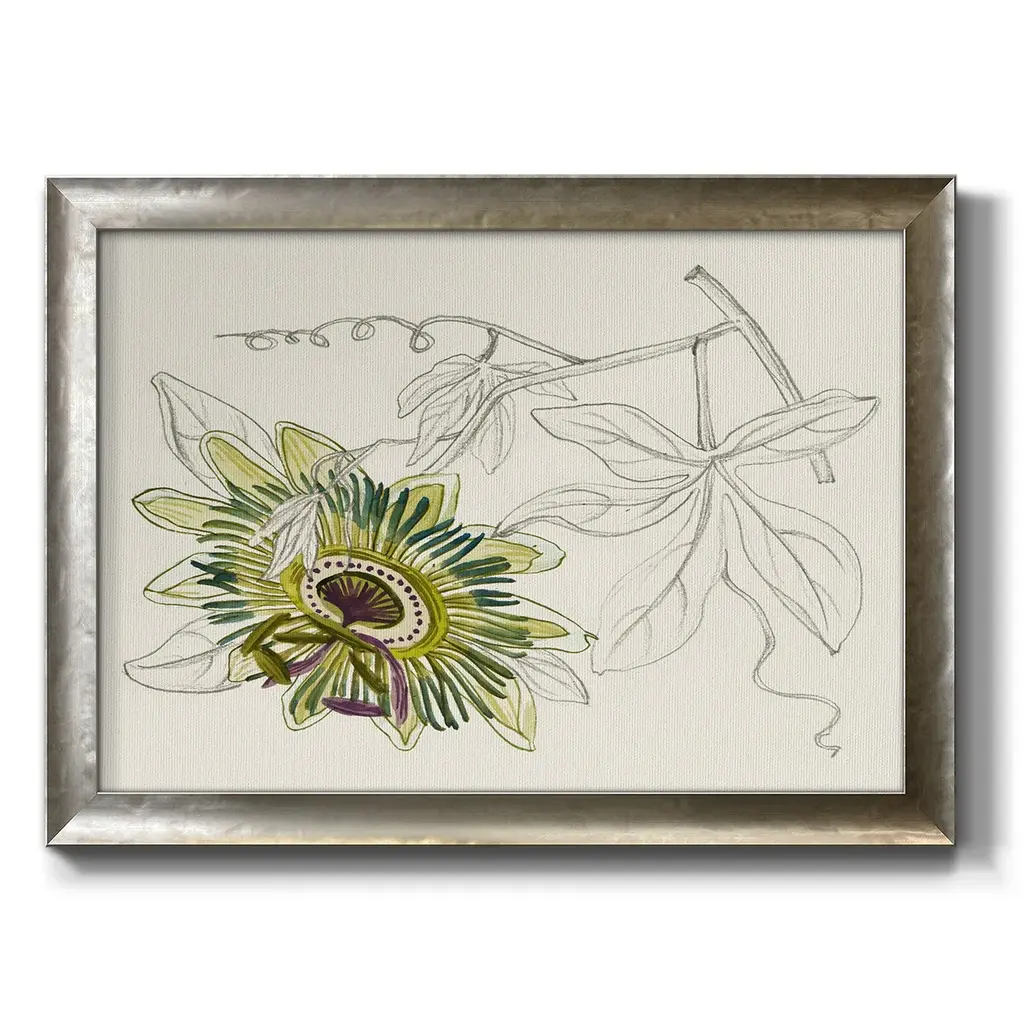 Passionflower III Premium Framed Canvas- Ready to Hang A Premium Framed Canvas created to last. Framed in distressed wood and available in an array of sizes and colors Featuring a beveled a solid wood stretcher bar, each piece comes ready to hand 3 SIZES AVAILABLE 16''X20'' - Overall Size 18'X27'' - Overall Size 24''x36'' - Overall Size Each piece is made to order. Each piece comes with hanging hardware. Made in the USA Ready to Hang Giclee Paper Print Acrylic Glass Beveled Matt Board