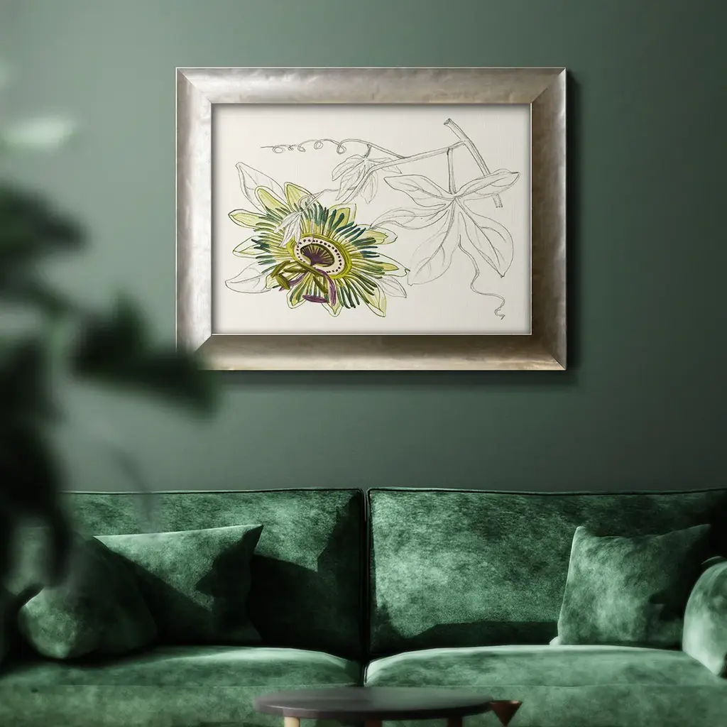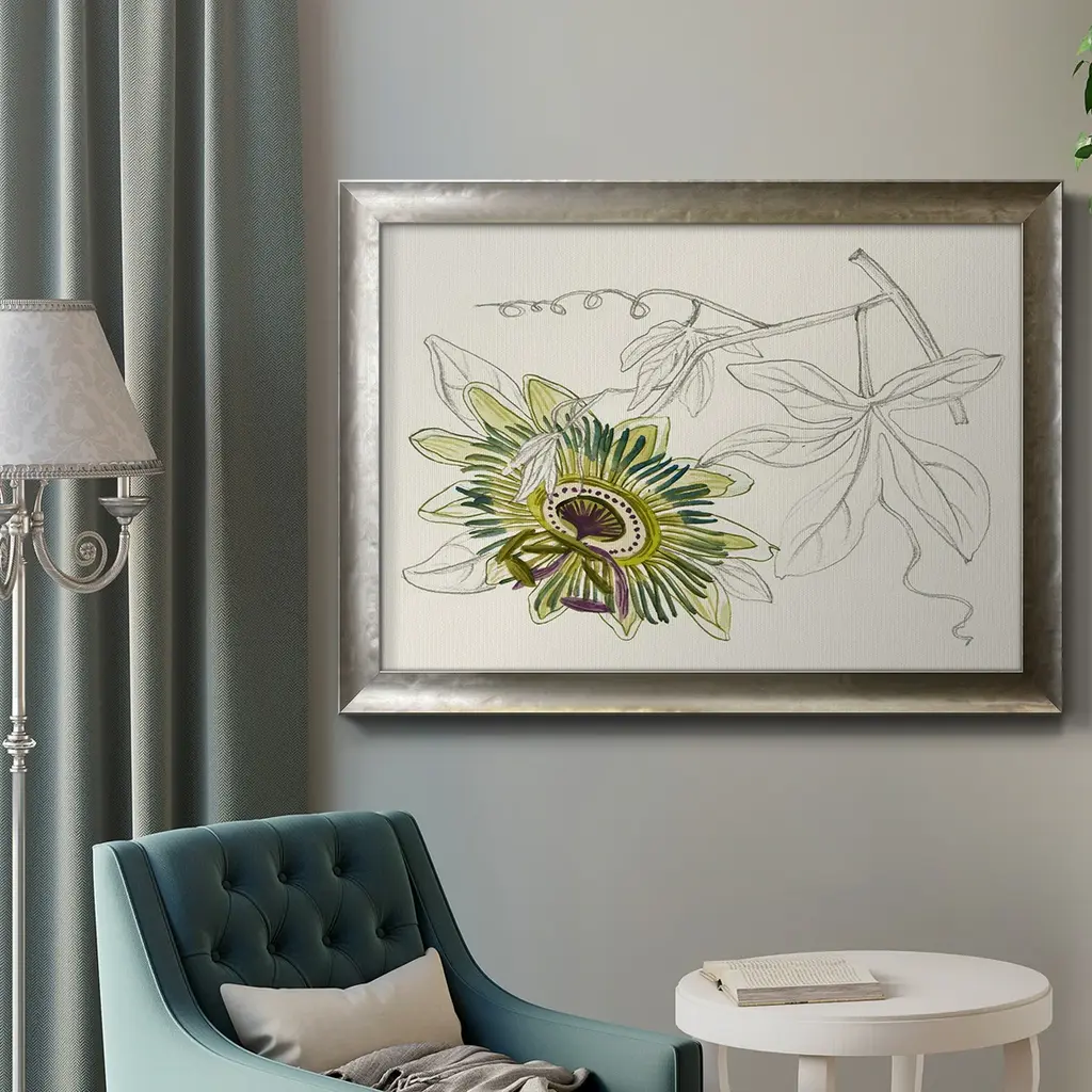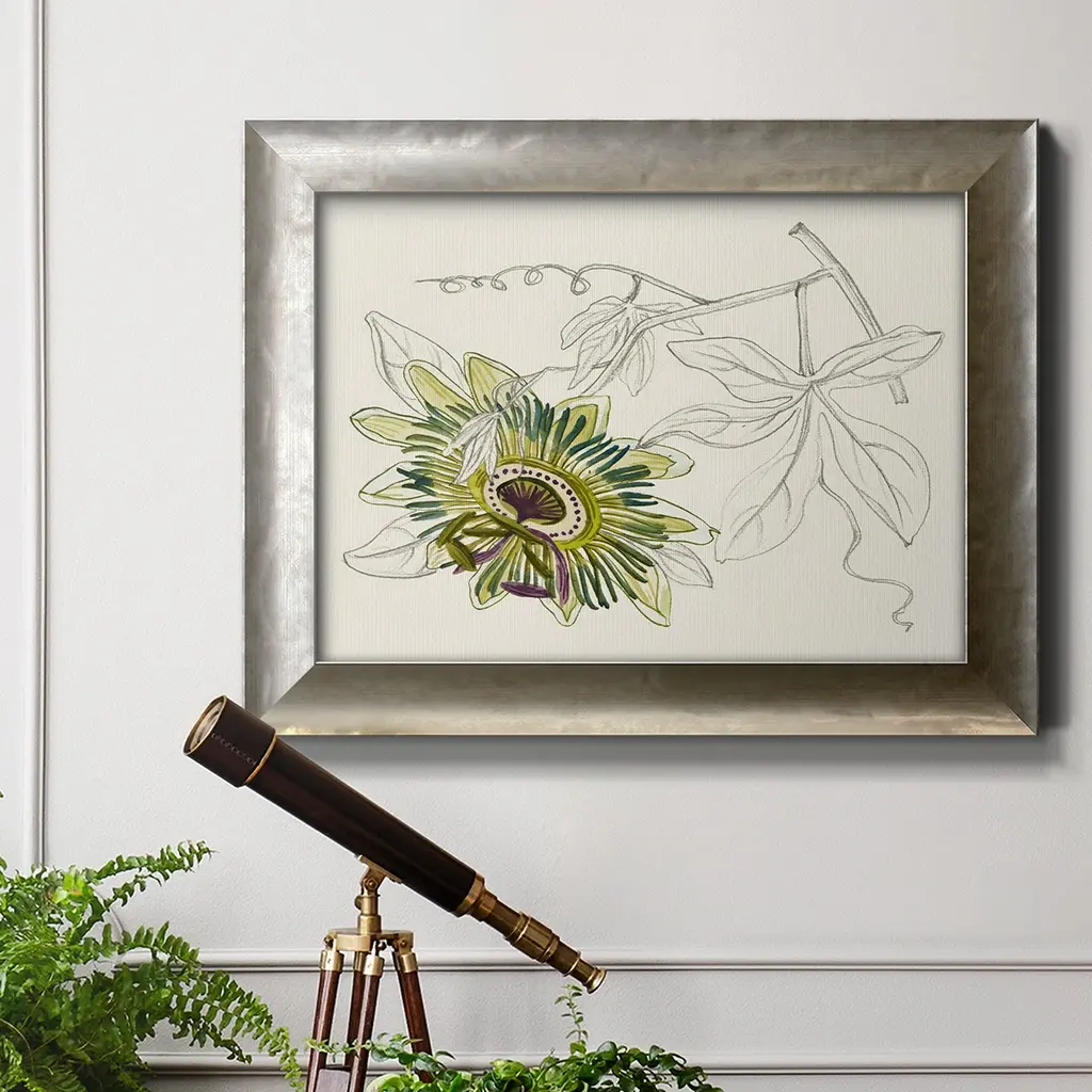 Passionflower III Premium Framed Canvas- Ready to Hang A Premium Framed Canvas created to last. Framed in distressed wood and available in an array of sizes and colors Featuring a beveled a solid wood stretcher bar, each piece comes ready to hand 3 SIZES AVAILABLE 16''X20'' - Overall Size 18'X27'' - Overall Size 24''x36'' - Overall Size Each piece is made to order. Each piece comes with hanging hardware. Made in the USA Ready to Hang Giclee Paper Print Acrylic Glass Beveled Matt Board