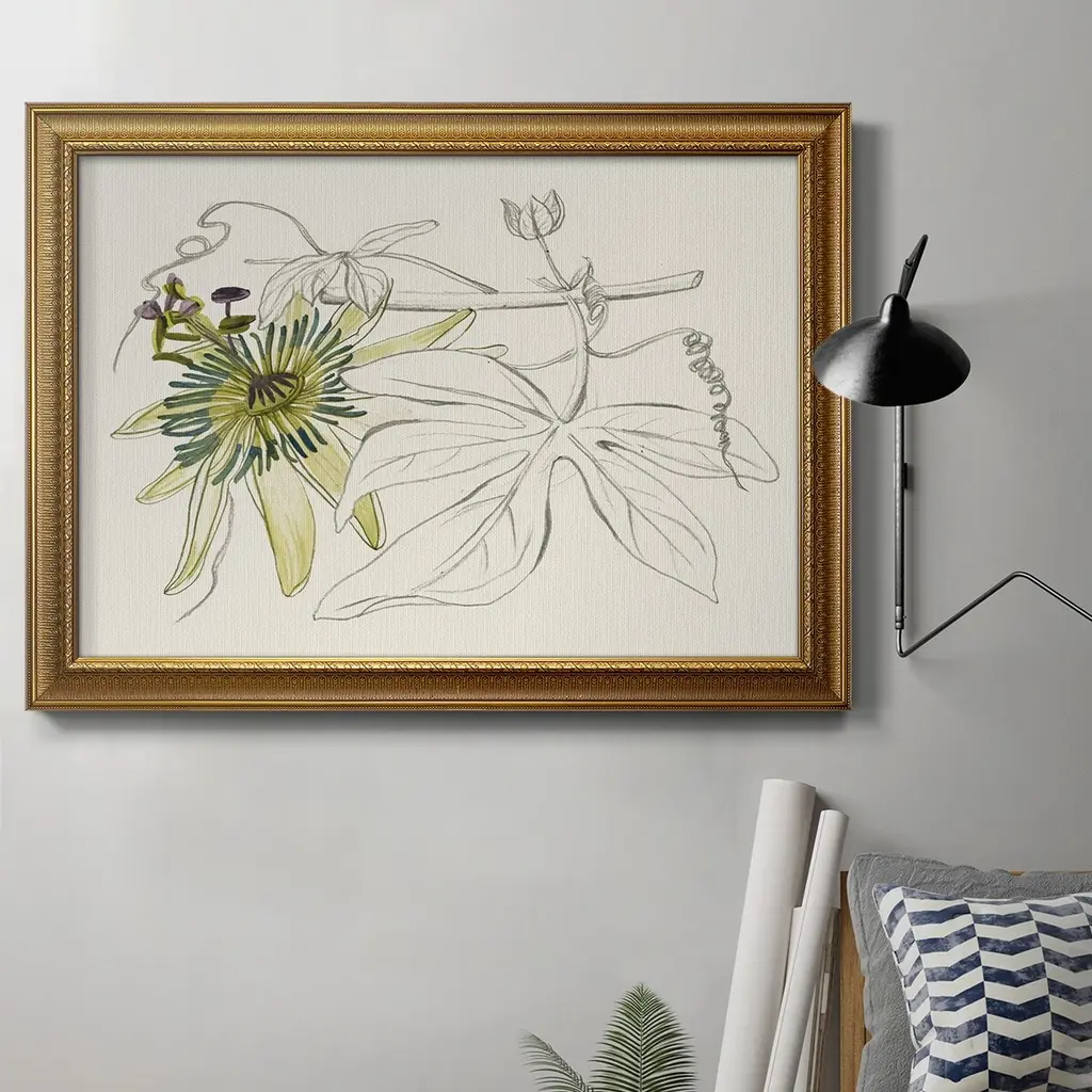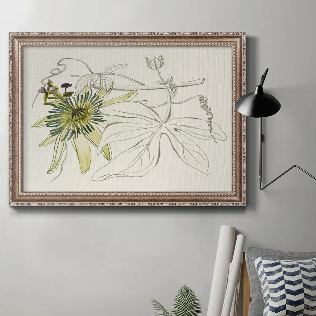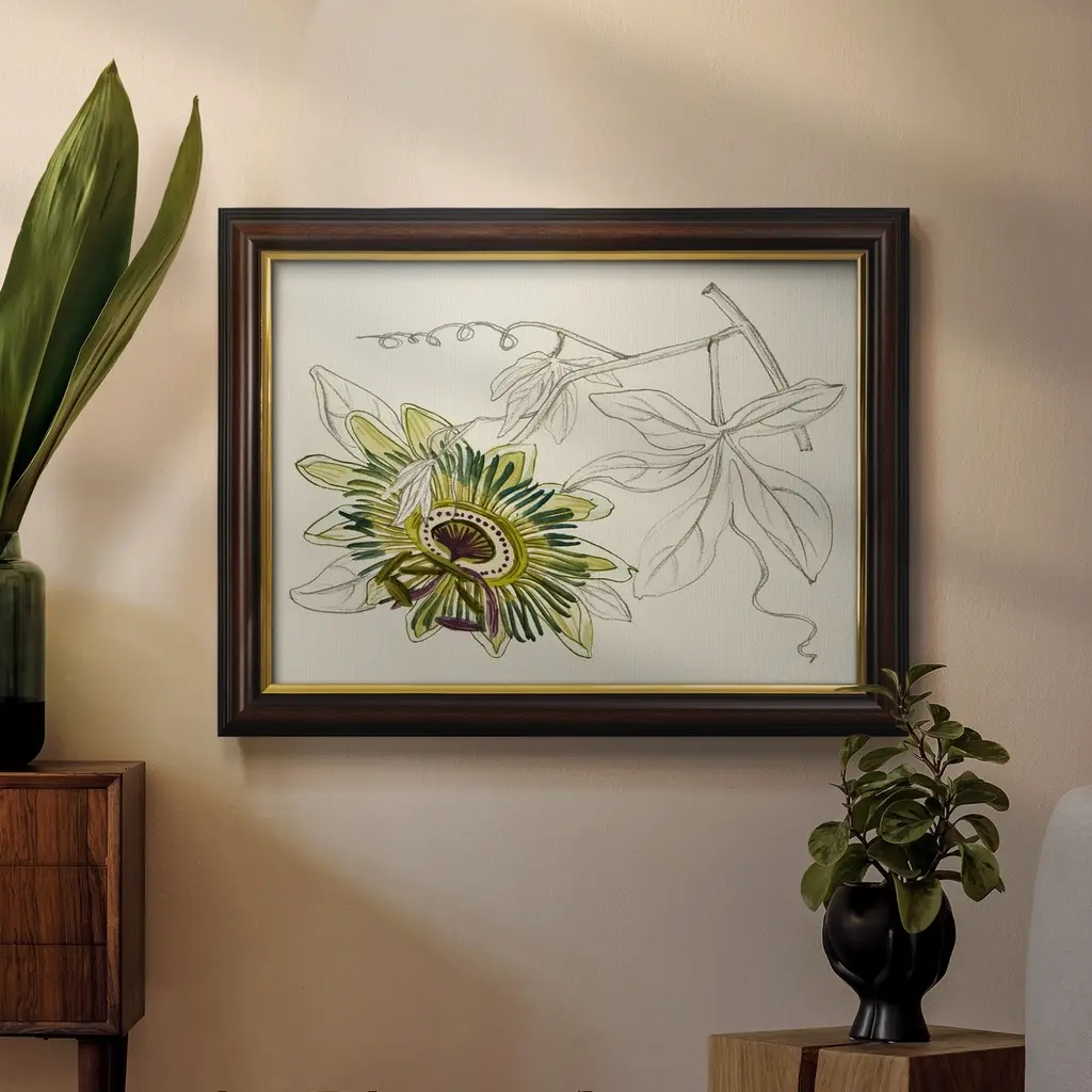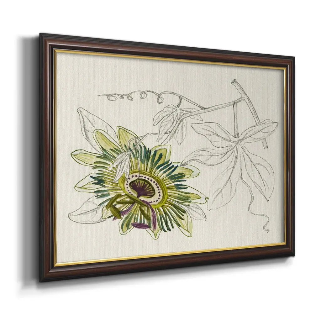 Passionflower III Premium Framed Canvas- Ready to Hang A Premium Framed Canvas created to last. Framed in distressed wood and available in an array of sizes and colors Featuring a beveled a solid wood stretcher bar, each piece comes ready to hand 3 SIZES AVAILABLE 16''X20'' - Overall Size 18'X27'' - Overall Size 24''x36'' - Overall Size Each piece is made to order. Each piece comes with hanging hardware. Made in the USA Ready to Hang Giclee Paper Print Acrylic Glass Beveled Matt Board