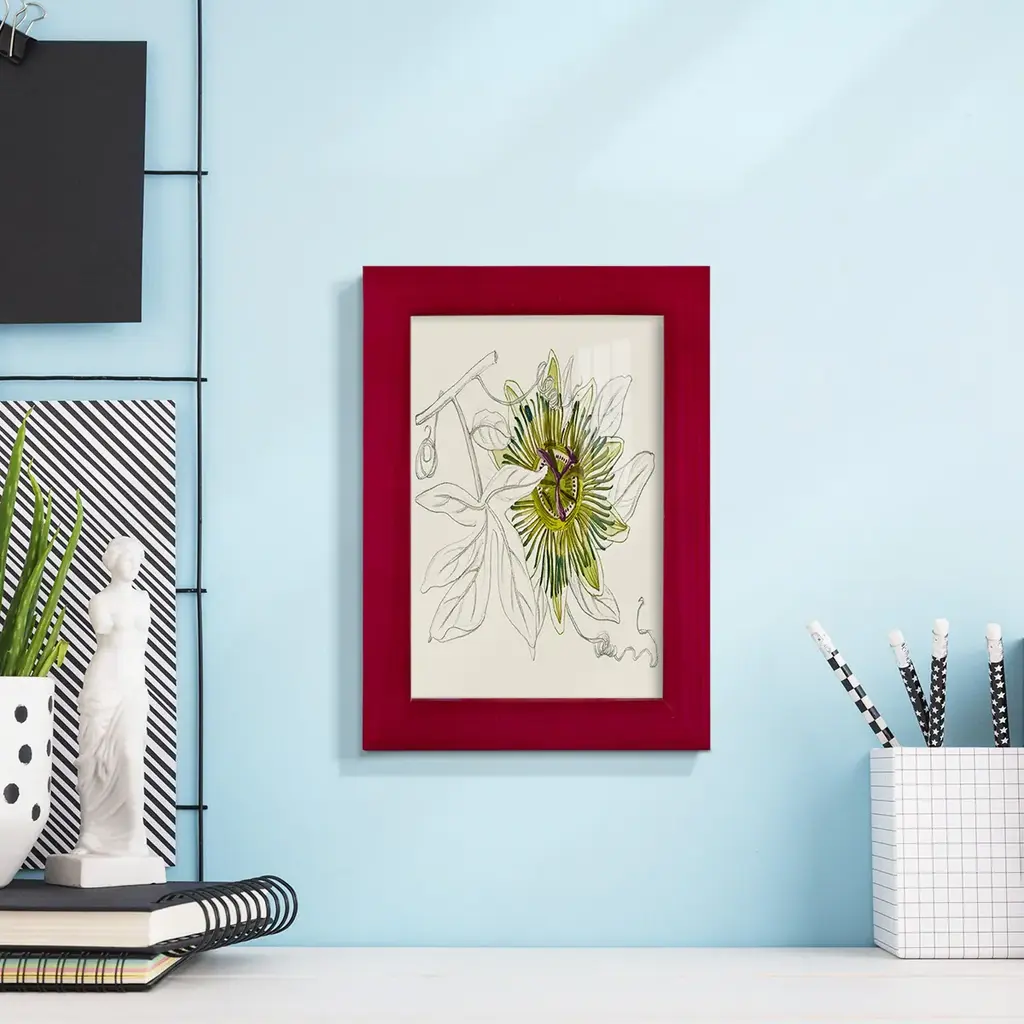 Passionflower IV -EZ SWITCH Framed Print w/glass-Cherry Red A delightful, framed print. Featuring a solid wood frame with real wood glass. This premium print is giclee quality. In addition, every frame features a removable back and table top stand. This allows you to change your art in the future or to just stand the art on a table for a new look. We are sure you'll enjoy our new series of EZ SWITCH Framed Art. Solid Wood Frame Real Glass Removable / Replaceable Art Built in Tabletop Stand Sizes range from 4x6 up to 12x15 - buy just one or pair them up as sets as you see fit.