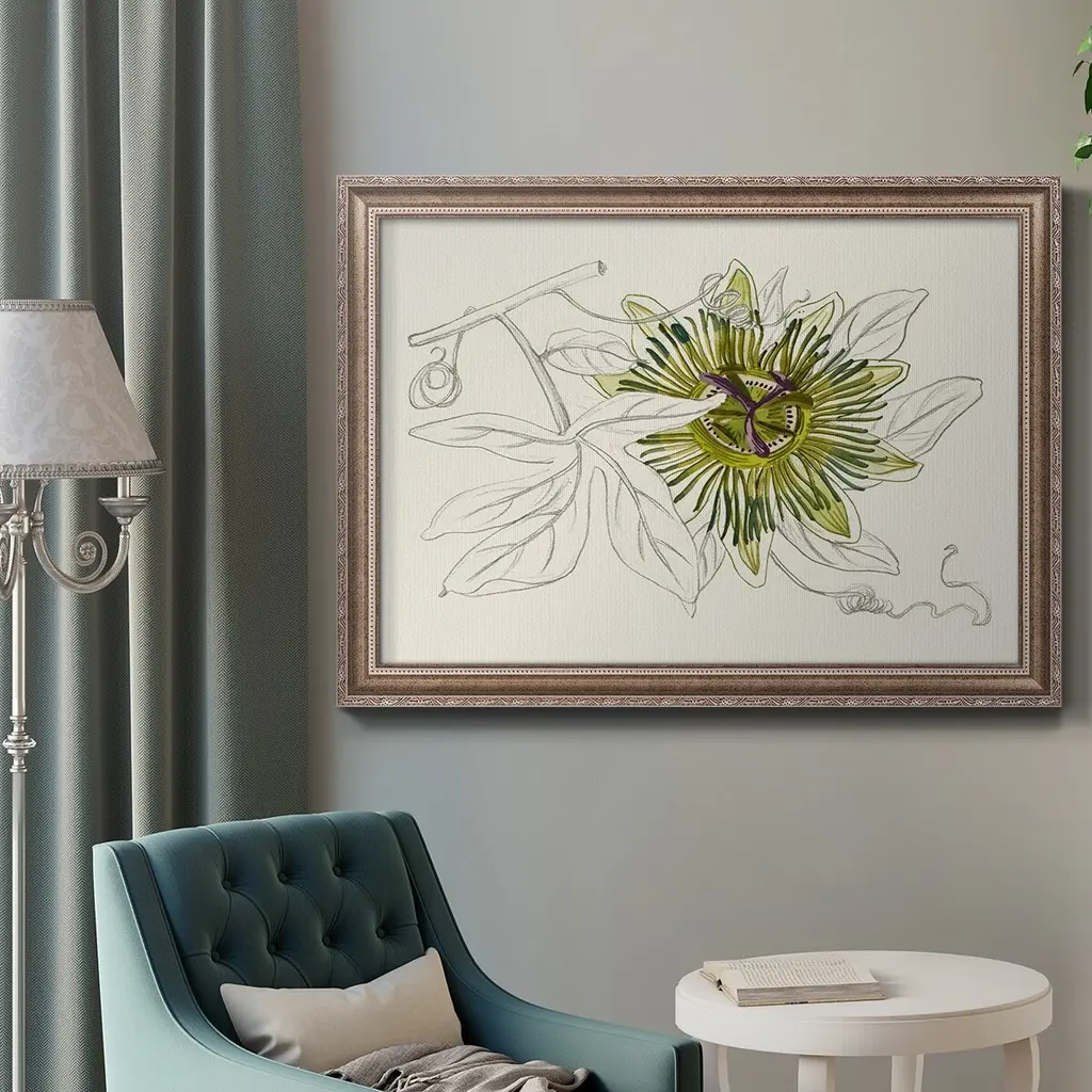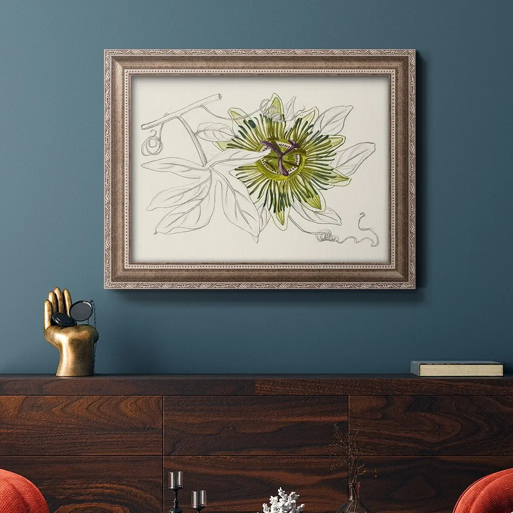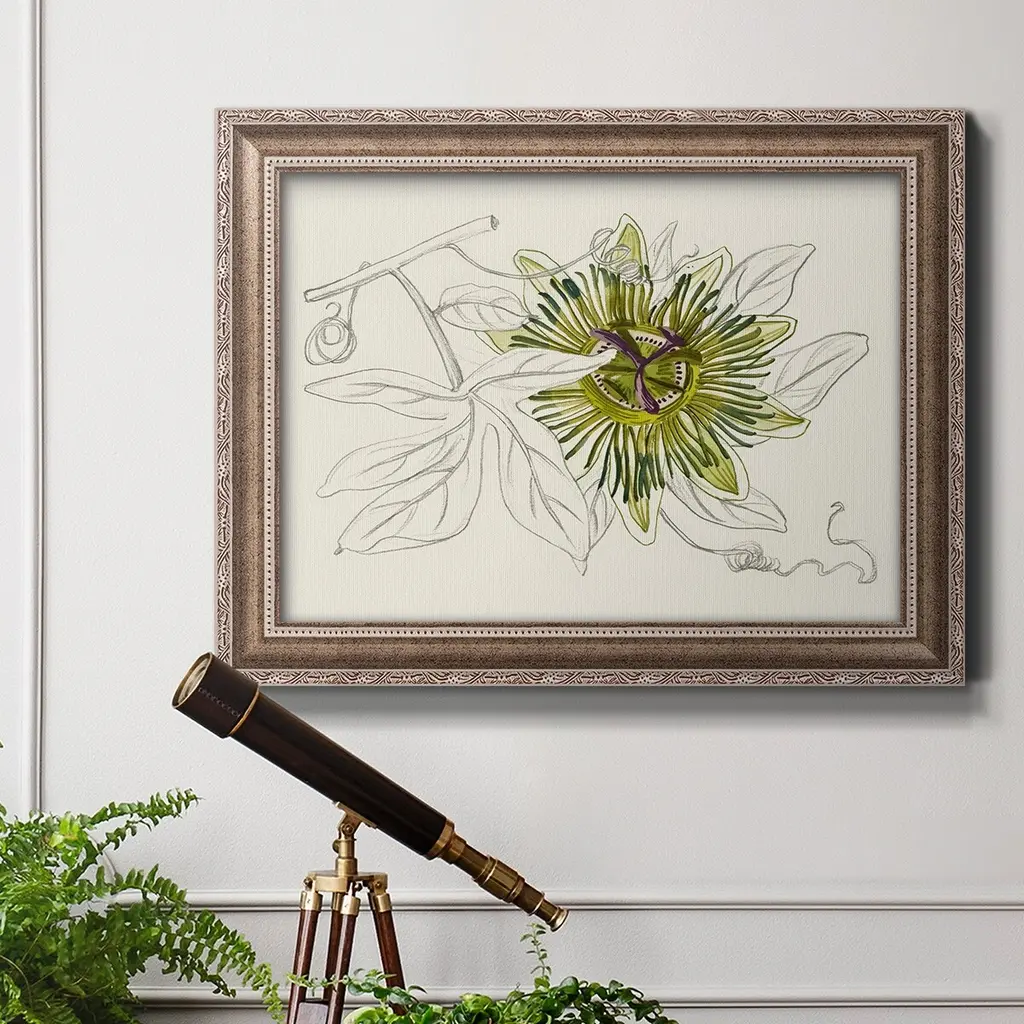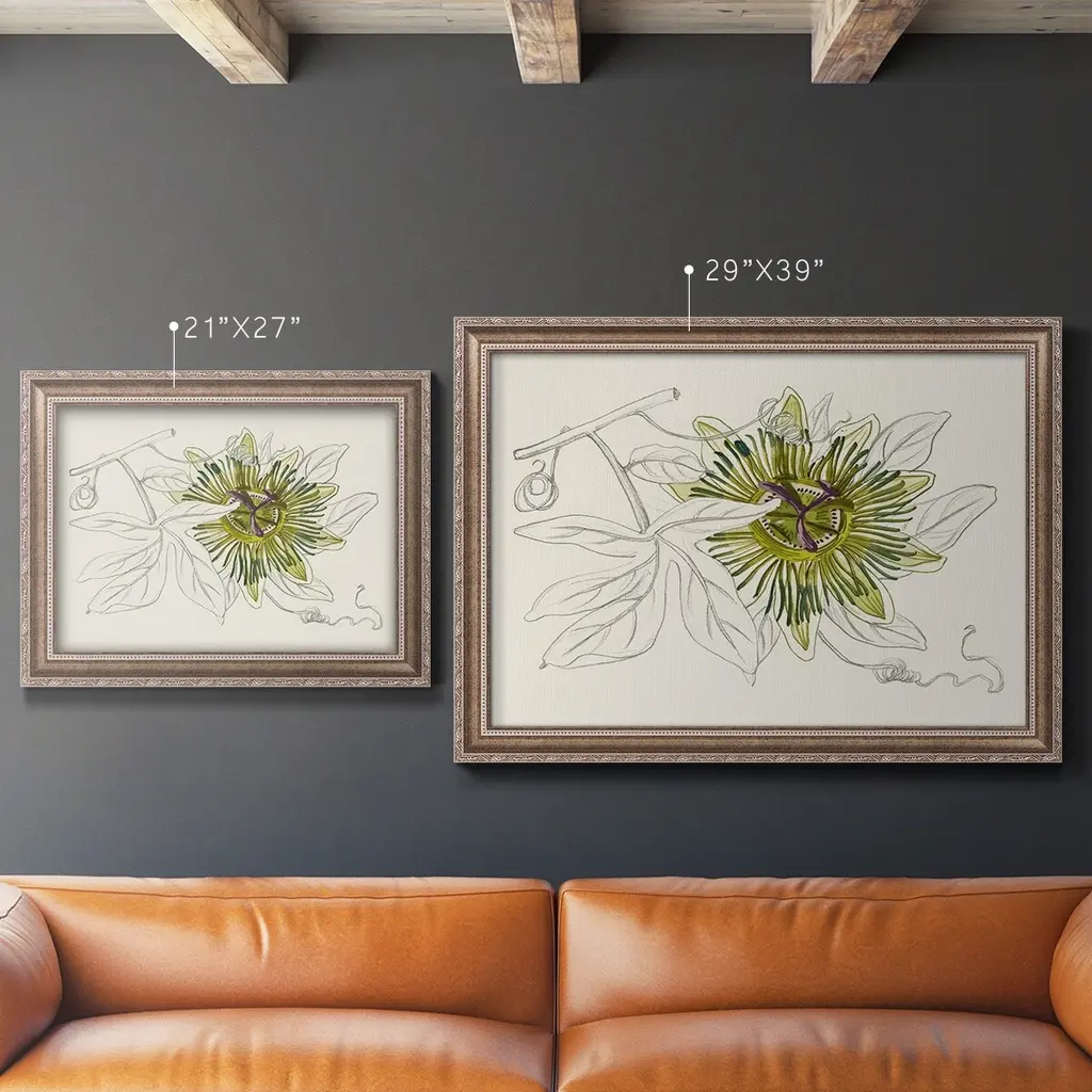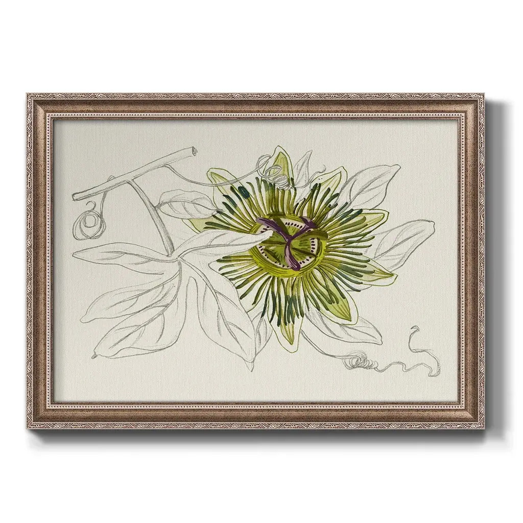 Passionflower IV Premium Framed Canvas- Ready to Hang A Premium Framed Canvas created to last. Framed in distressed wood and available in an array of sizes and colors Featuring a beveled a solid wood stretcher bar, each piece comes ready to hand 3 SIZES AVAILABLE 16''X20'' - Overall Size 18'X27'' - Overall Size 24''x36'' - Overall Size Each piece is made to order. Each piece comes with hanging hardware. Made in the USA Ready to Hang Giclee Paper Print Acrylic Glass Beveled Matt Board