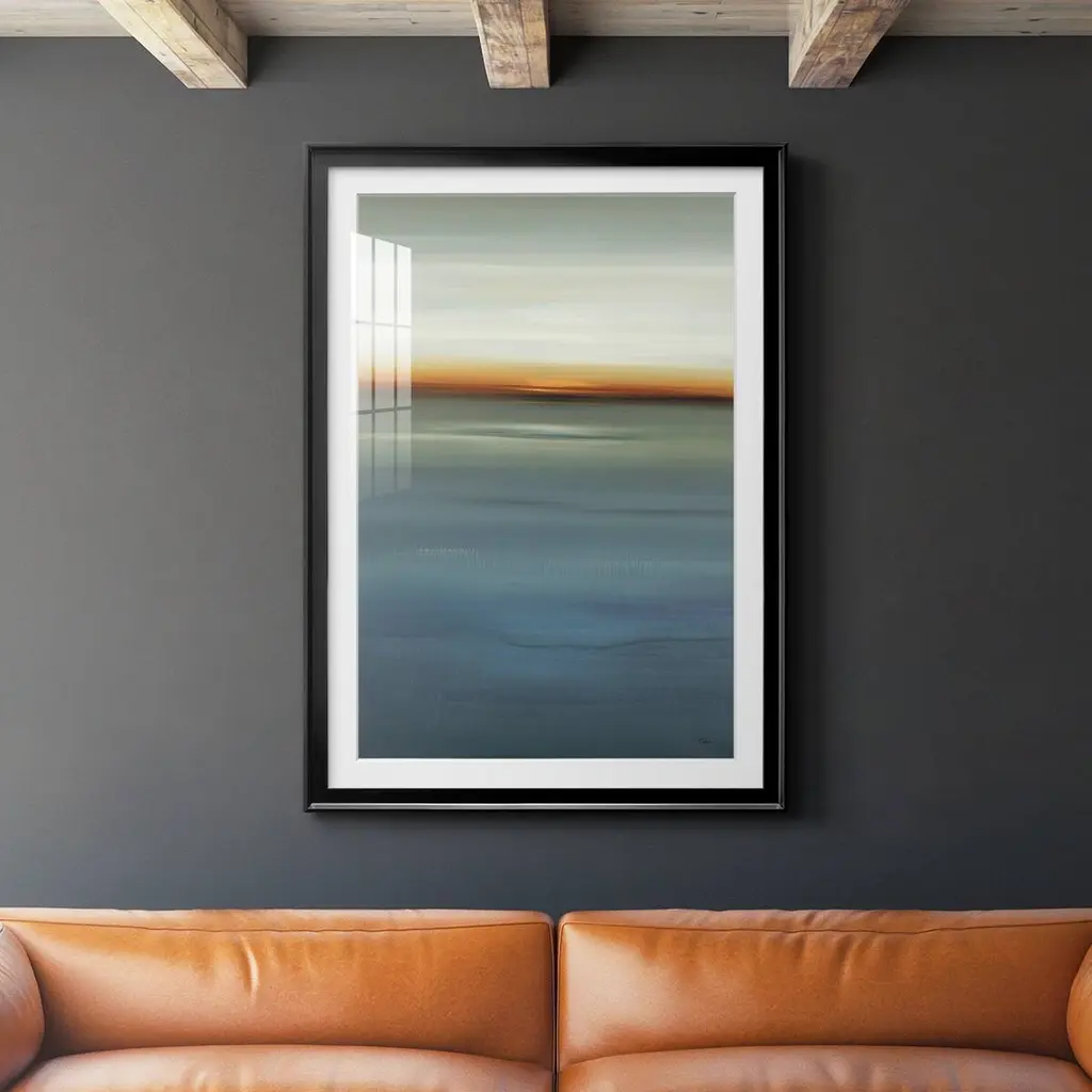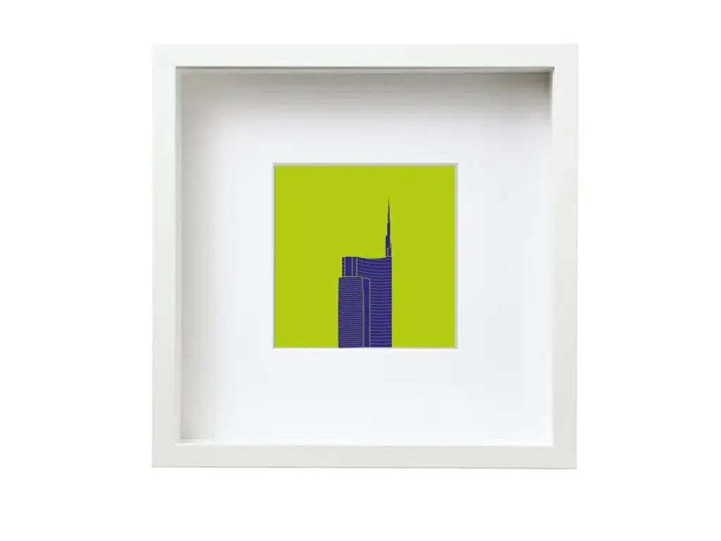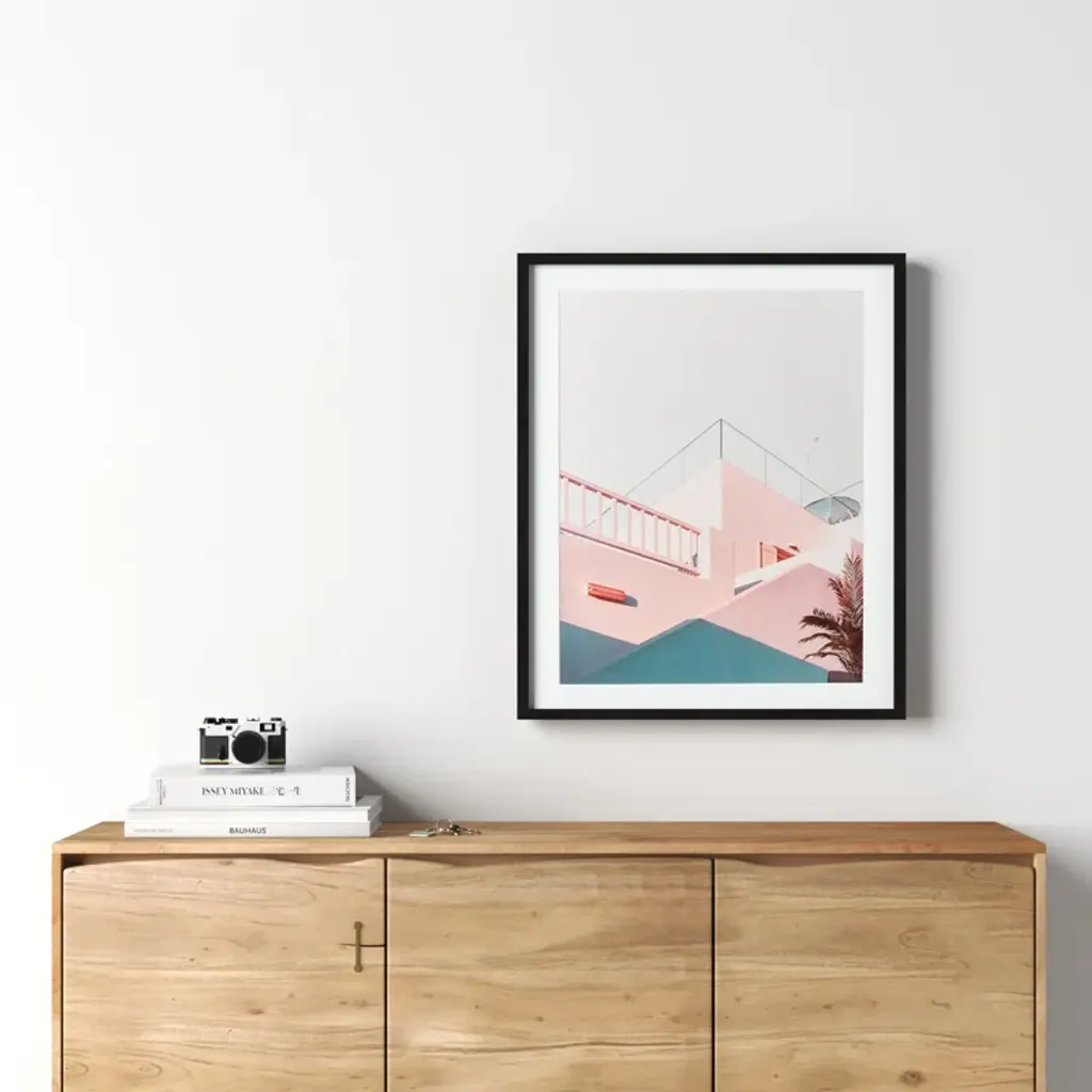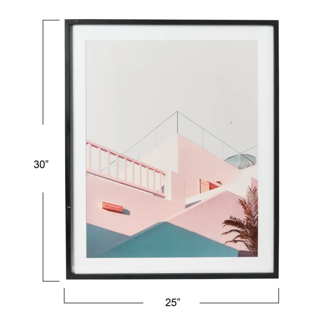 Your everyday vacation house. This graphic print depicts a detail of a beachy pastel building, with a palm tree in the foreground and sleek geometric lines against a sunny sky. It’s printed on paper and arrives matted and framed.