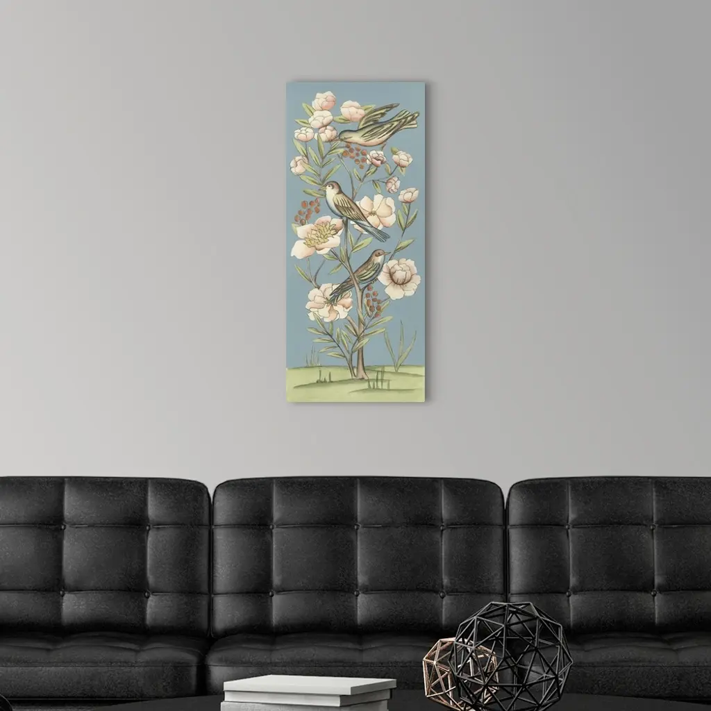 Colorful whimsical artwork of garden birds perched on flowering plant.