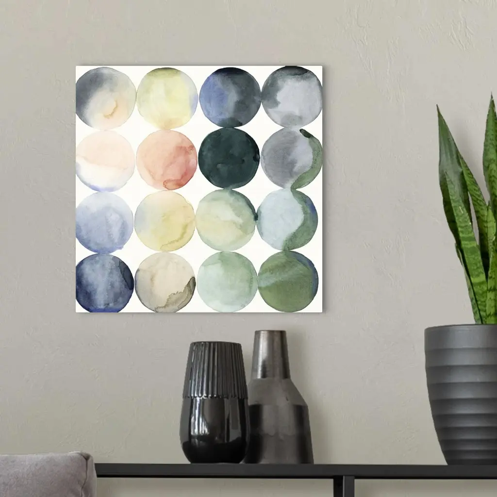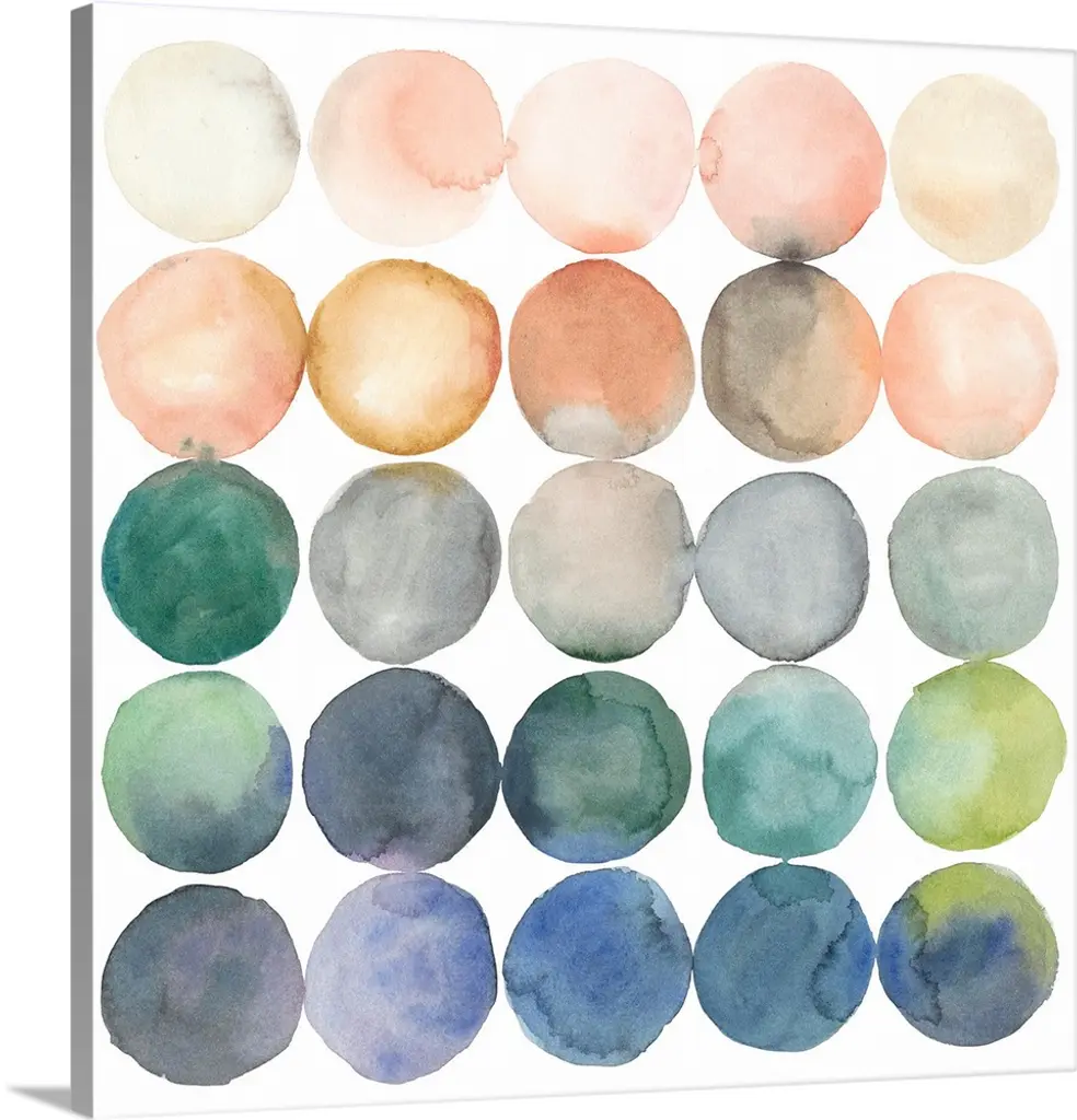 Watercolor painting of colorful circles in rows on a white, square background.