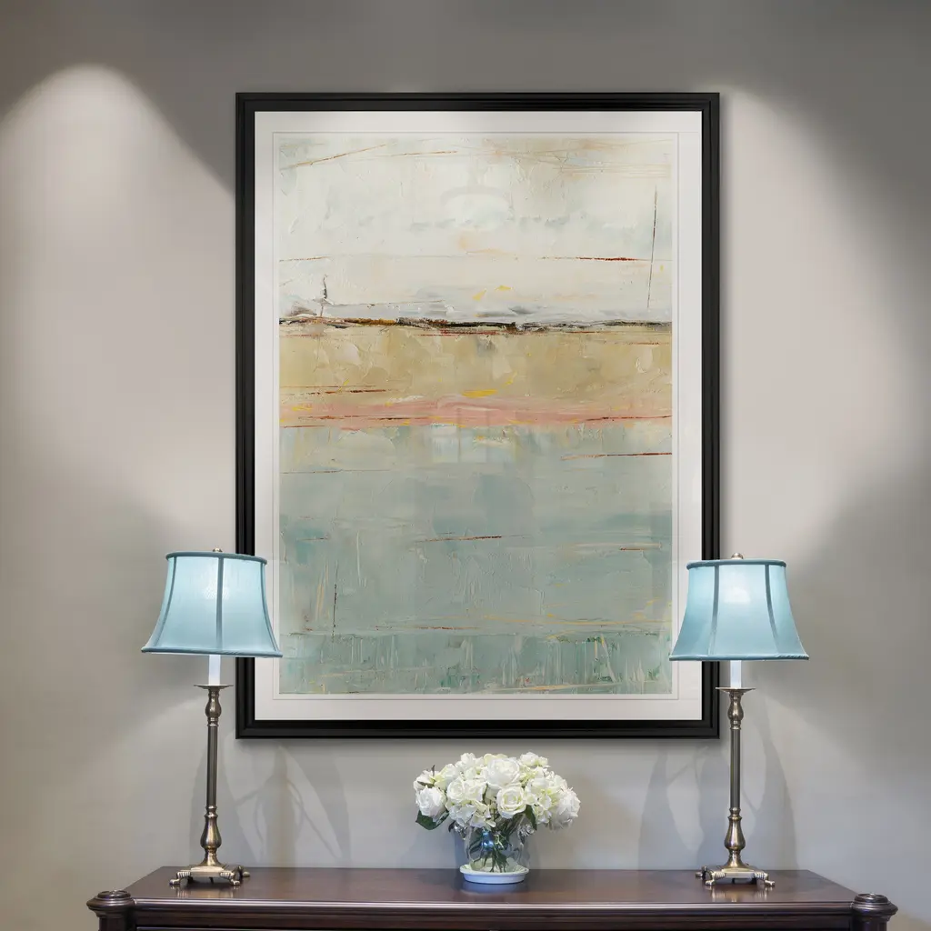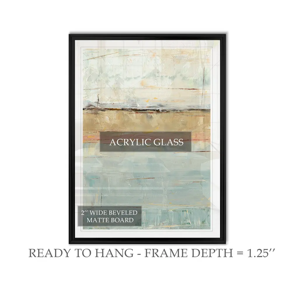 Pastel Horizon I -Custom Framed Print A premium custom framed giclee print Featuring a beveled a matt , acrylic glass, and a high quality giclee print BLACK FRAMED - 4 SIZES AVAILABLE - BLACK FRAMED 18''x24''- Overall Size 22''x30'' - Overall Size 26''x36''' - Overall Size 30''x42''' - Overall Size Each piece is made to order. Built to Last Each piece comes ready to hang Fade and Water resistant Made domestically