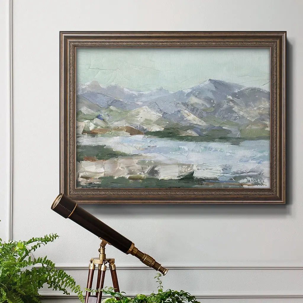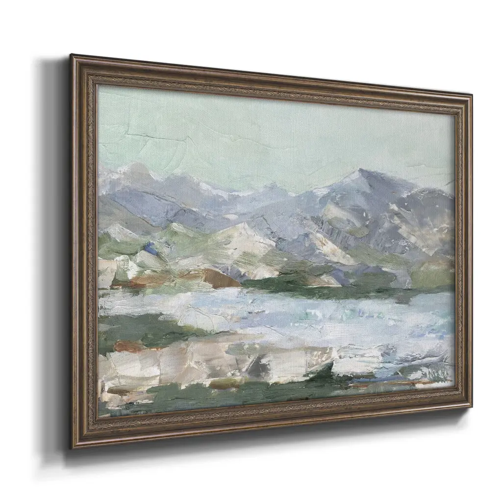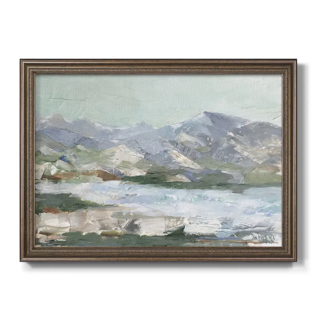 Pastel Mountain View I Premium Framed Canvas- Ready to Hang A Premium Framed Canvas created to last. Framed in distressed wood and available in an array of sizes and colors Featuring a beveled a solid wood stretcher bar, each piece comes ready to hand 3 SIZES AVAILABLE 16''X20'' - Overall Size 18'X27'' - Overall Size 24''x36'' - Overall Size Each piece is made to order. Each piece comes with hanging hardware. Made in the USA Ready to Hang Giclee Paper Print Acrylic Glass Beveled Matt Board