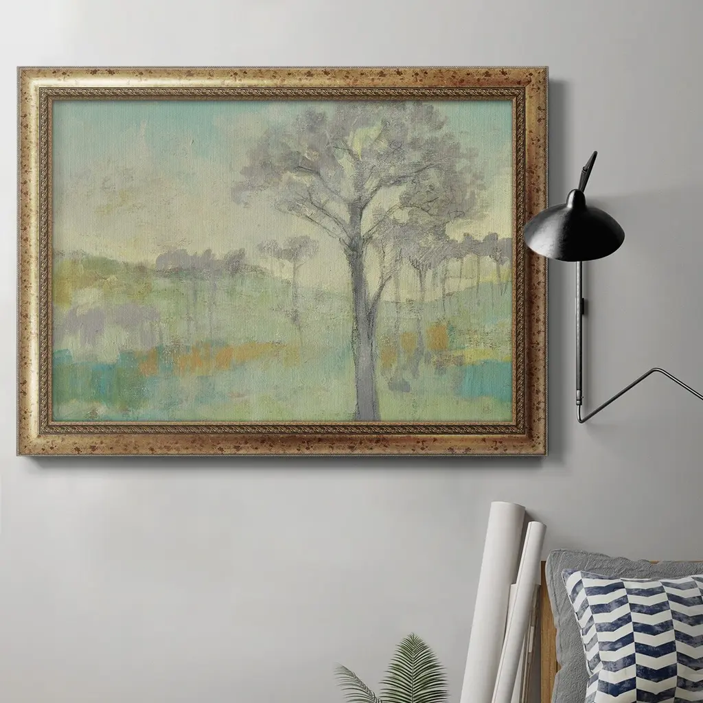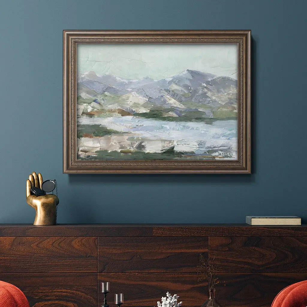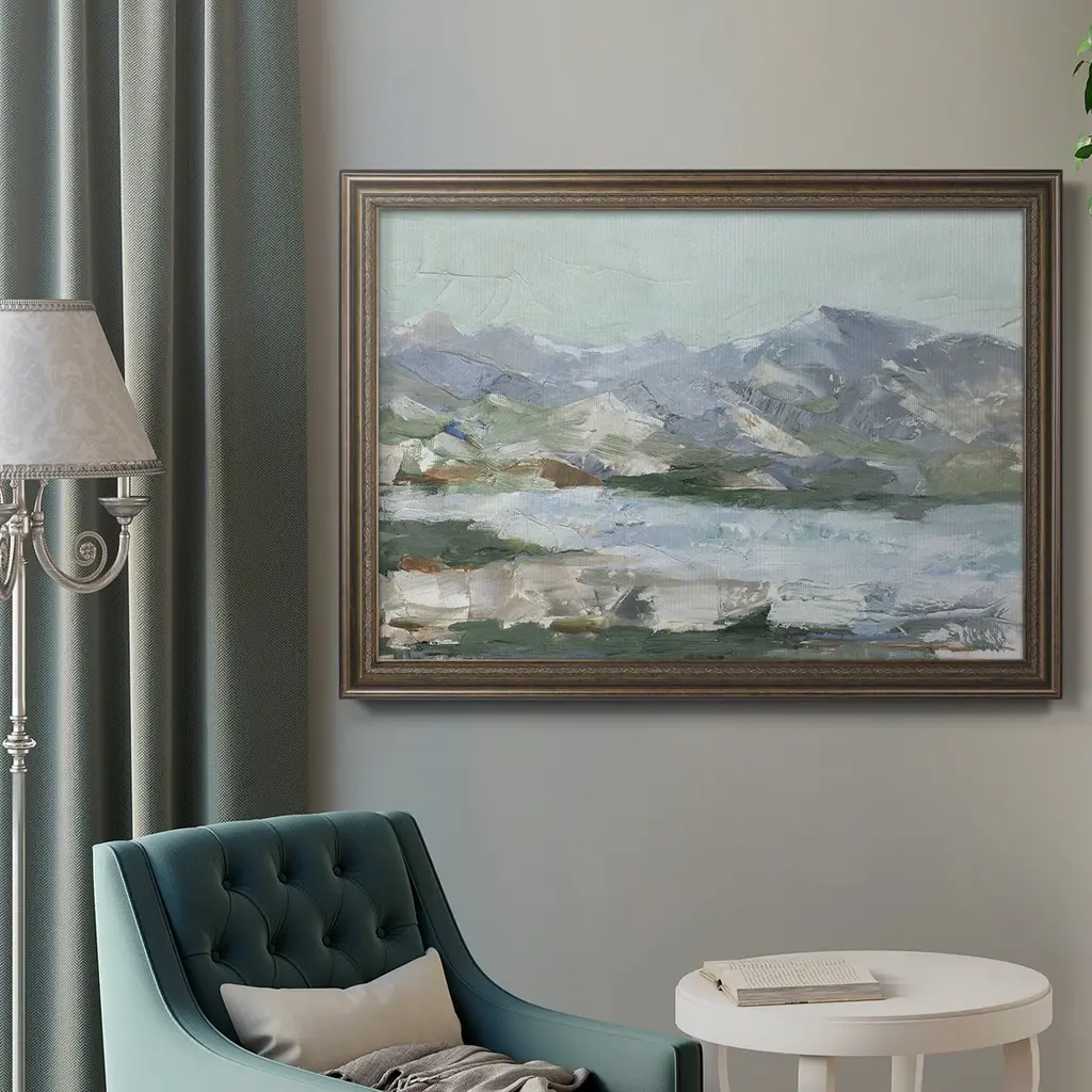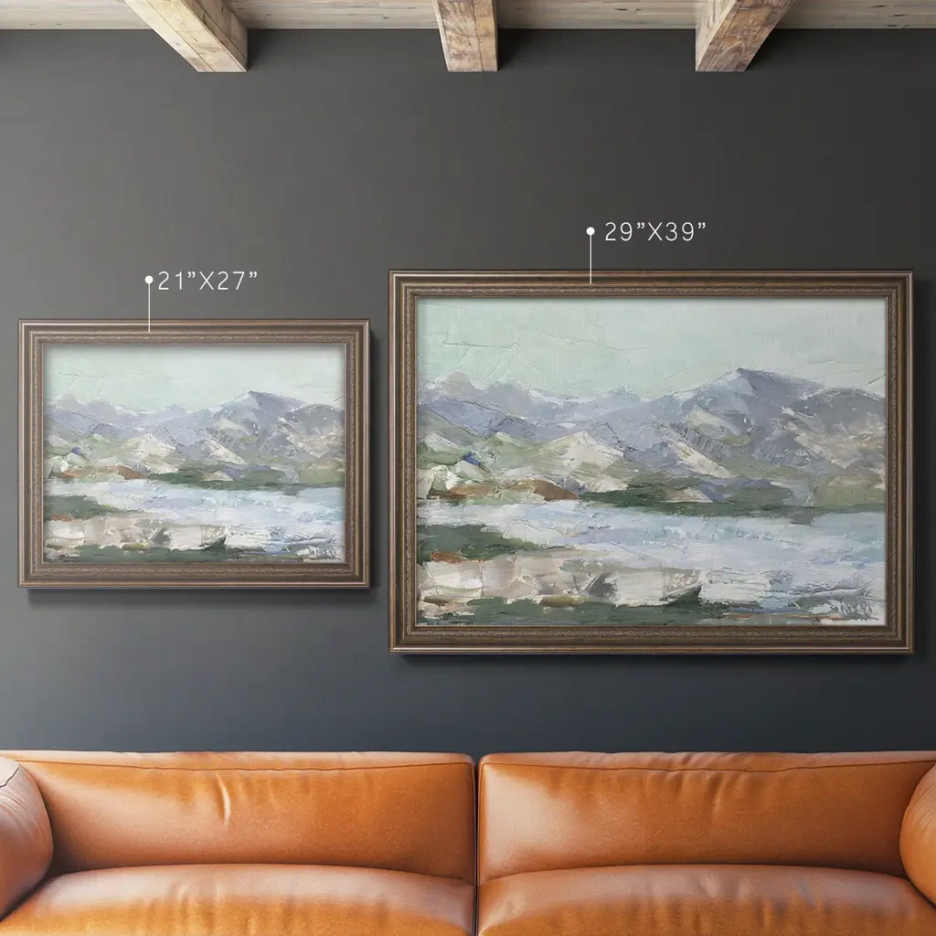 Pastel Mountain View I Premium Framed Canvas- Ready to Hang A Premium Framed Canvas created to last. Framed in distressed wood and available in an array of sizes and colors Featuring a beveled a solid wood stretcher bar, each piece comes ready to hand 3 SIZES AVAILABLE 16''X20'' - Overall Size 18'X27'' - Overall Size 24''x36'' - Overall Size Each piece is made to order. Each piece comes with hanging hardware. Made in the USA Ready to Hang Giclee Paper Print Acrylic Glass Beveled Matt Board