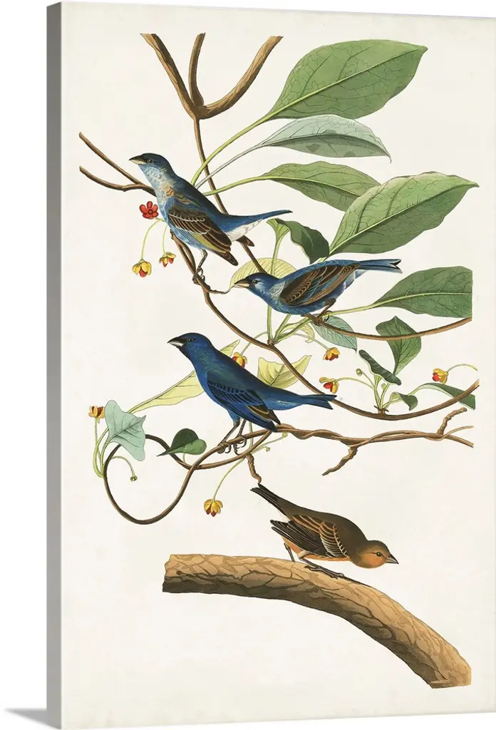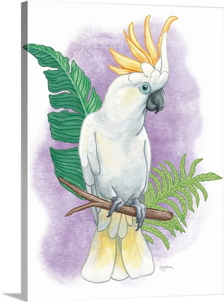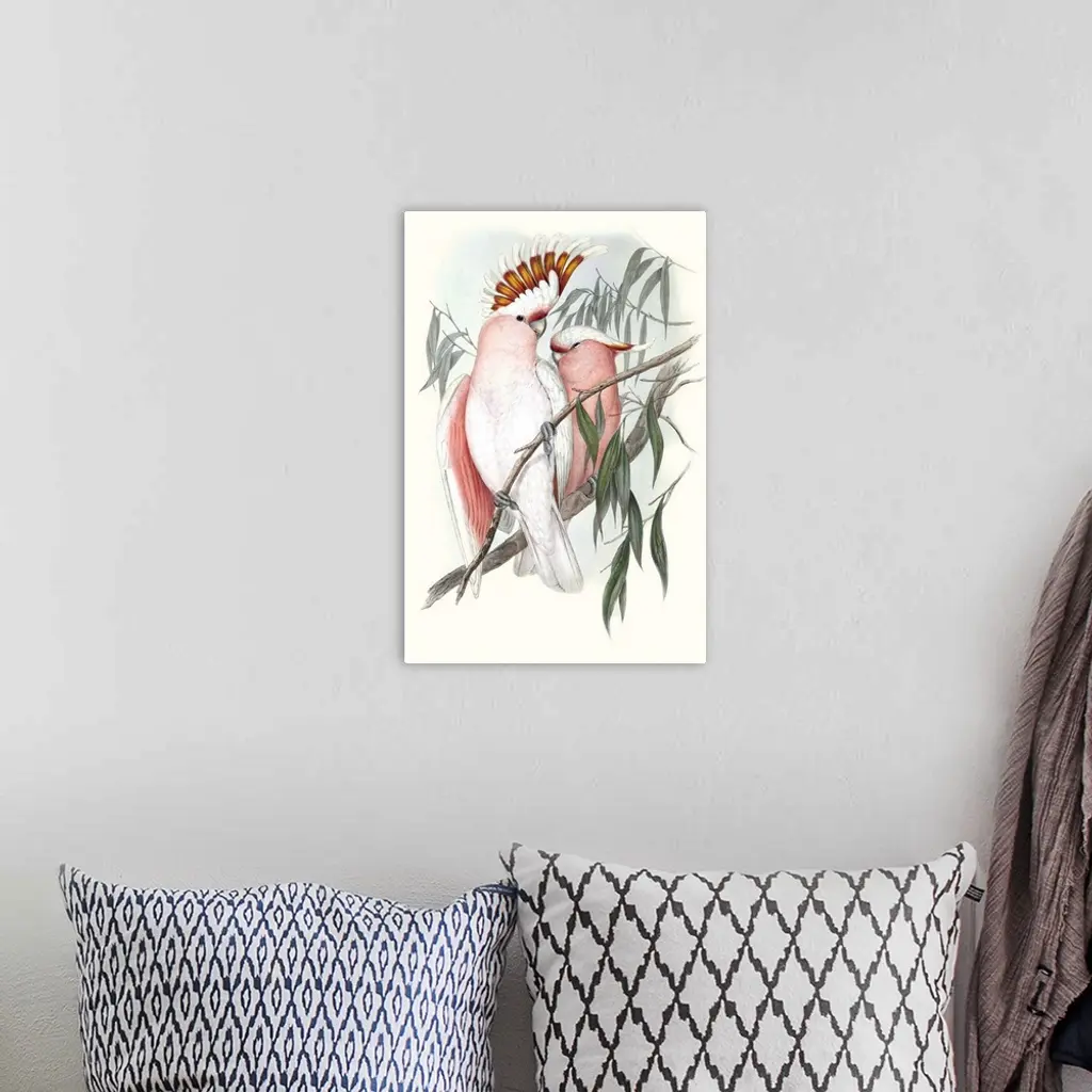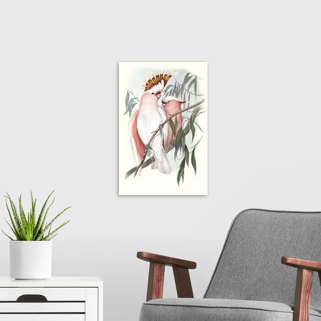 Decorative artwork of tropical parrots perched on branches in pastel tones.