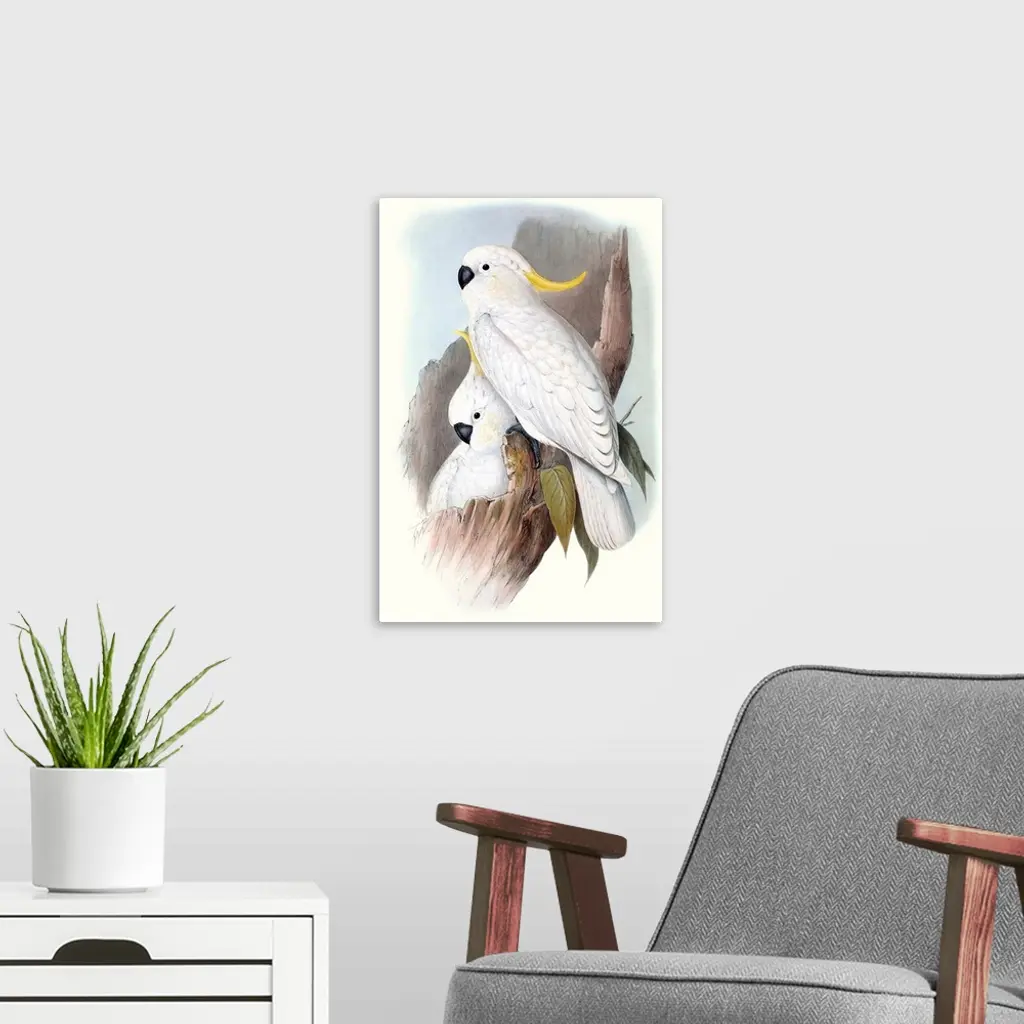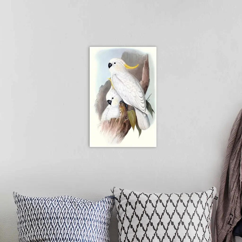 Decorative artwork of tropical parrots perched on branches in pastel tones.